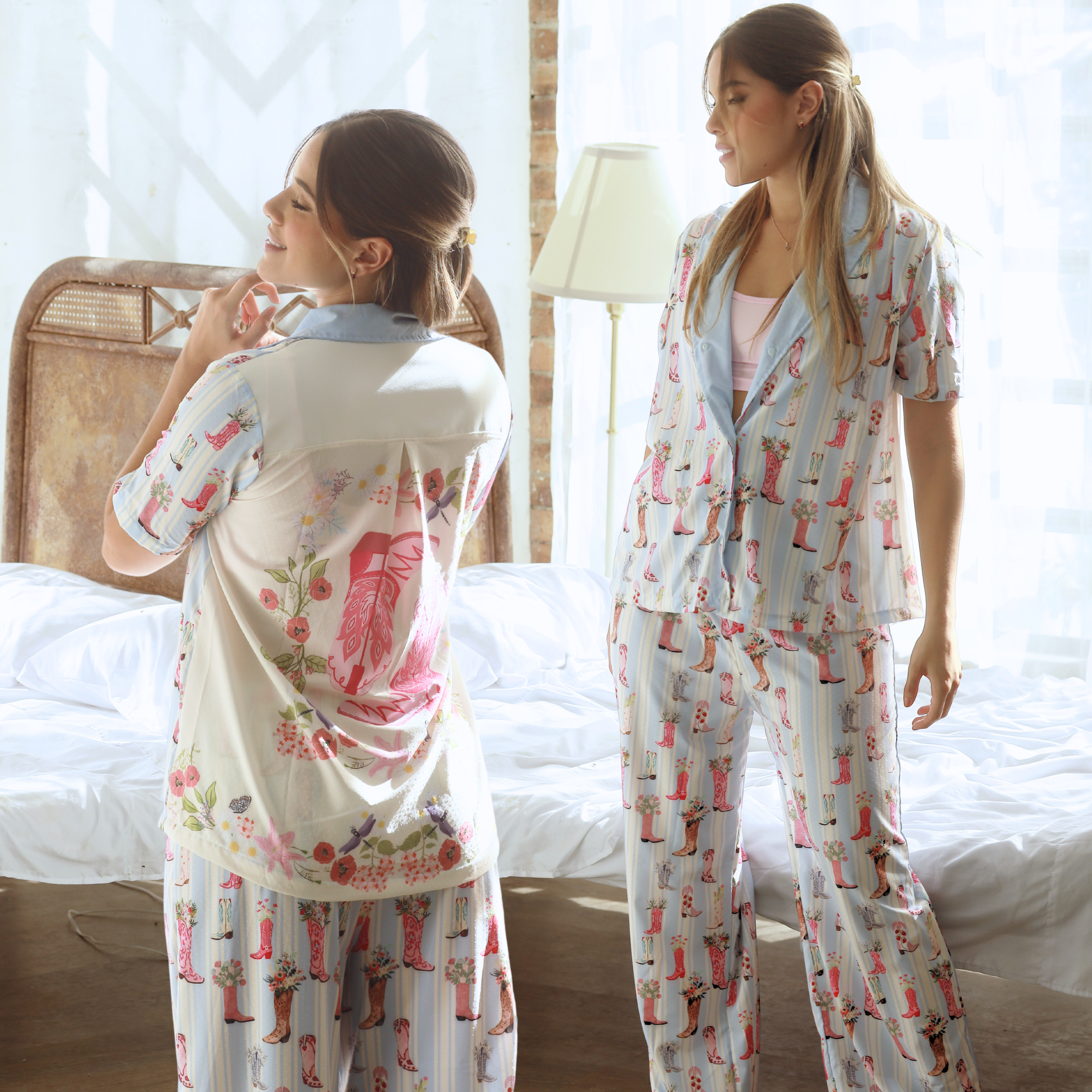 Pijama de dos piezas compuesta por Camisa de botones y pantalón, Diseñada en tela fresca, cómoda y liviana que brinda suavidad y libertad de movimiento, ideal para acompañar tus noches de descanso.