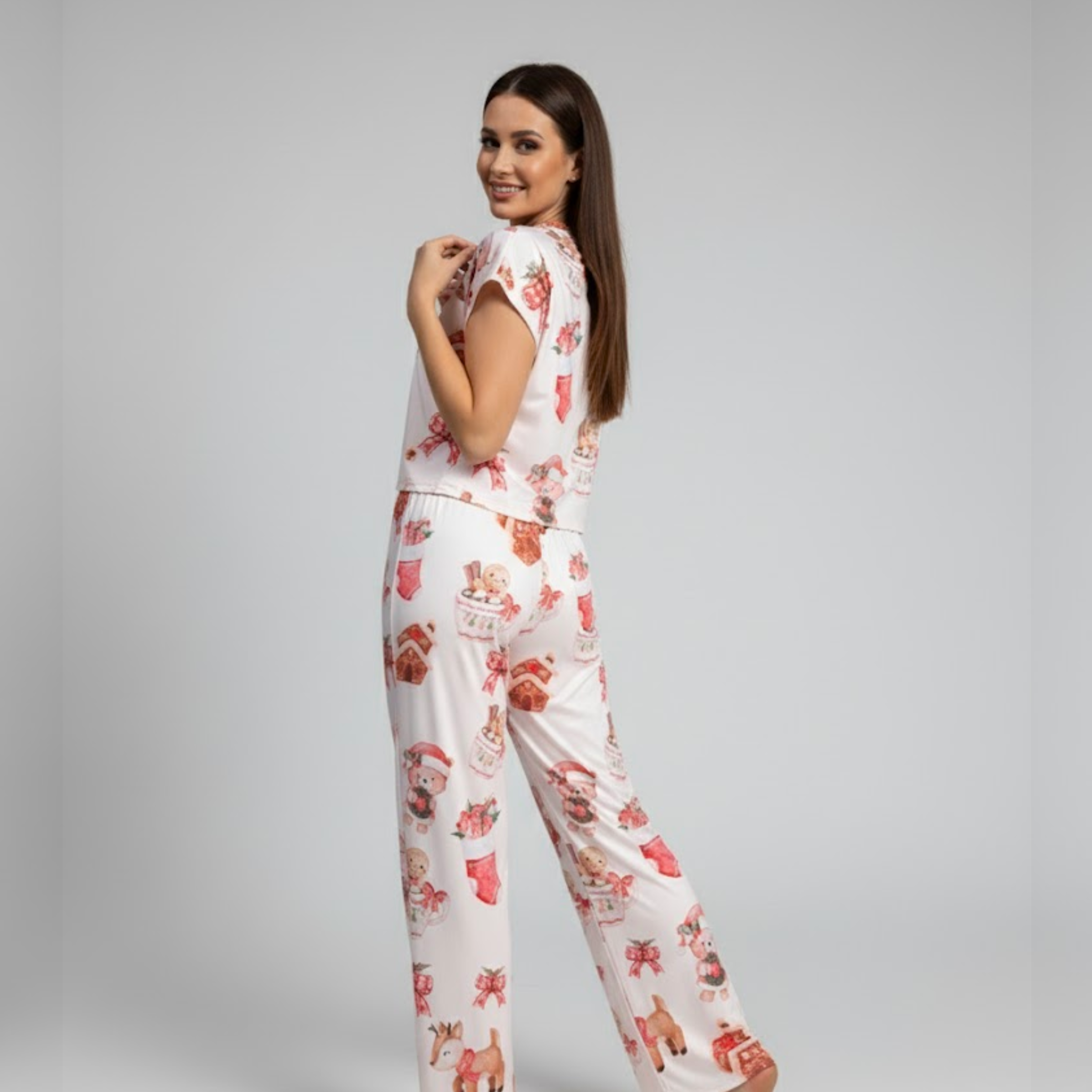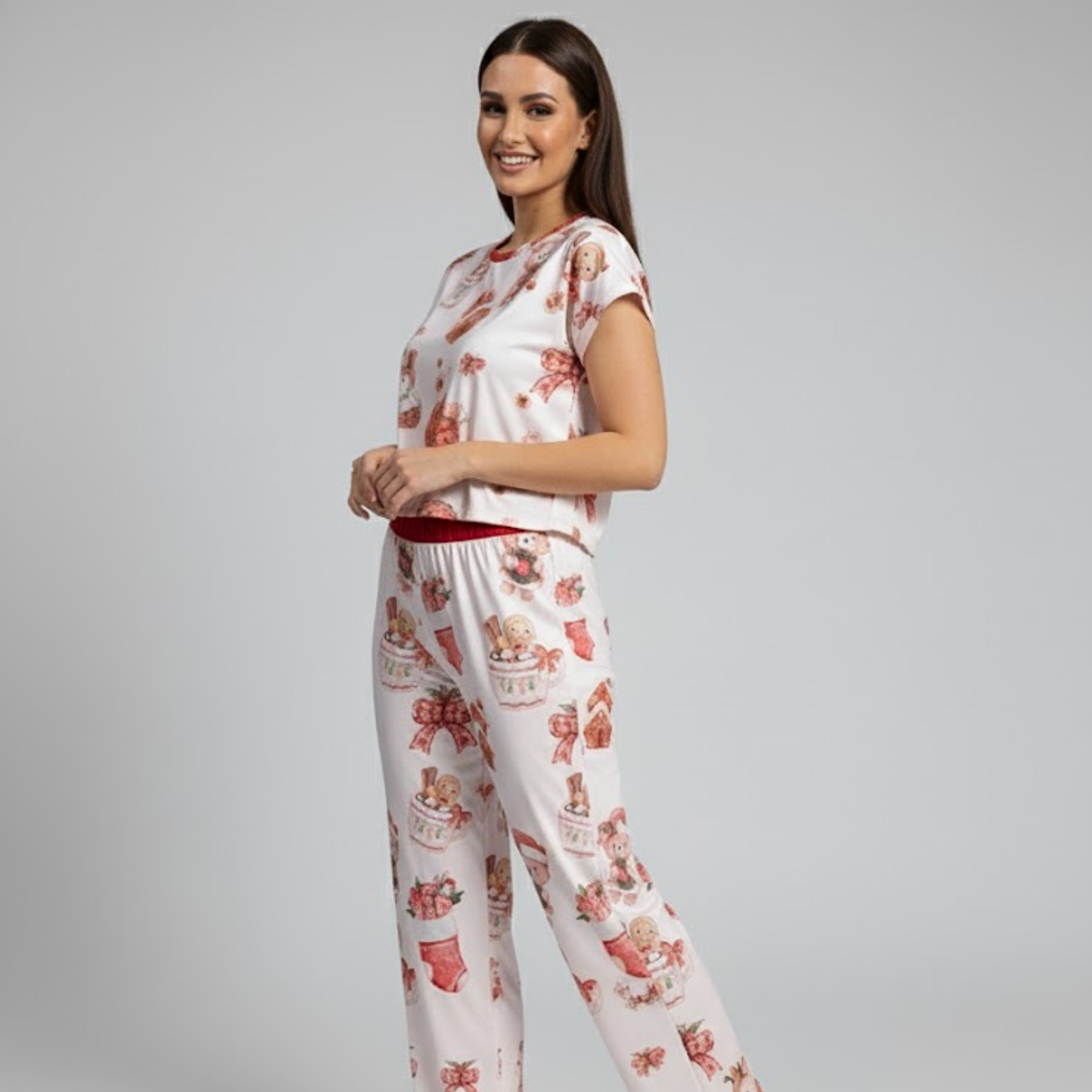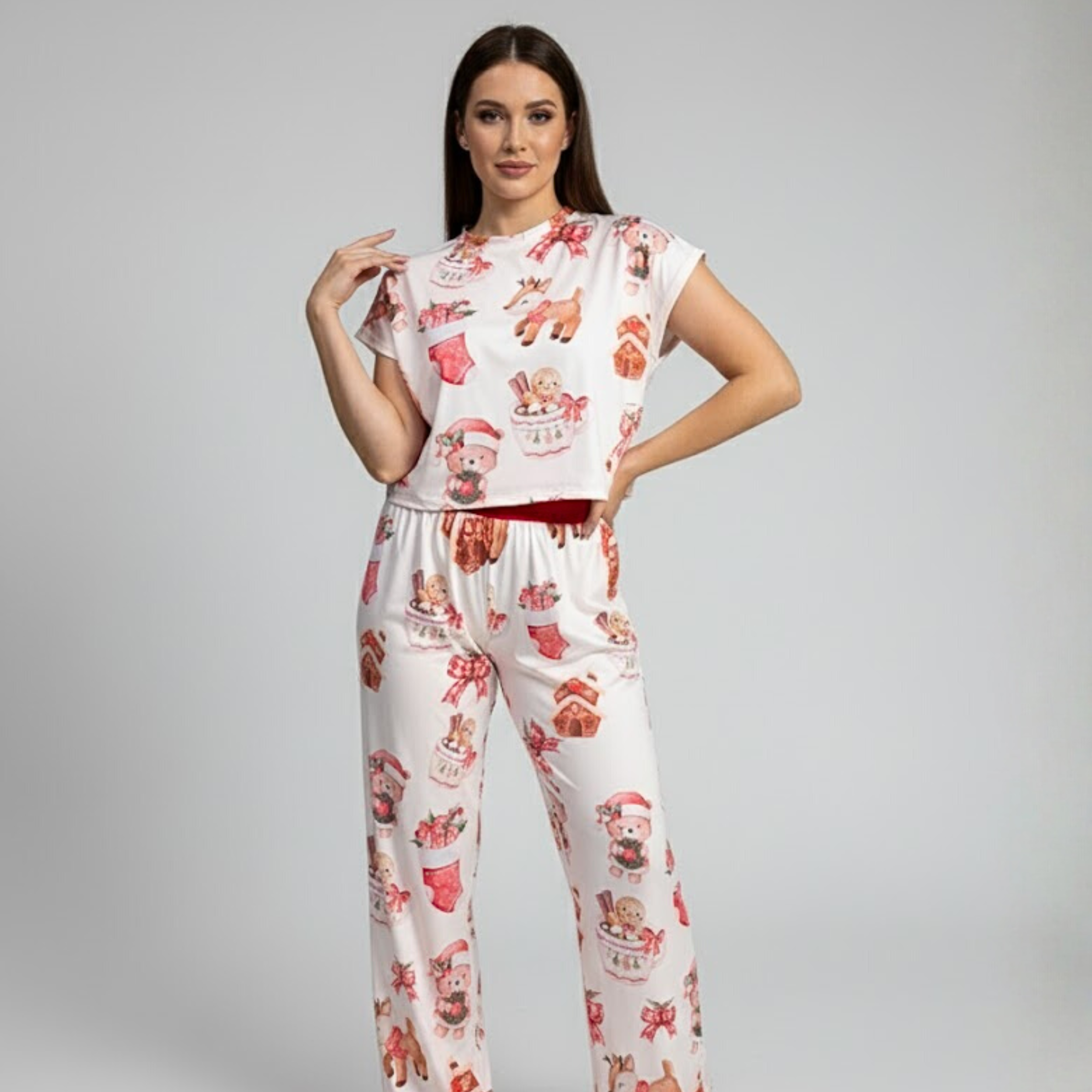Pijama de dos piezas compuesta por blusa corta sublimada y pantalón con elástico en pretina. Diseñada en tela fresca, cómoda y liviana que brinda suavidad y libertad de movimiento, ideal para acompañar tus noches de descanso.