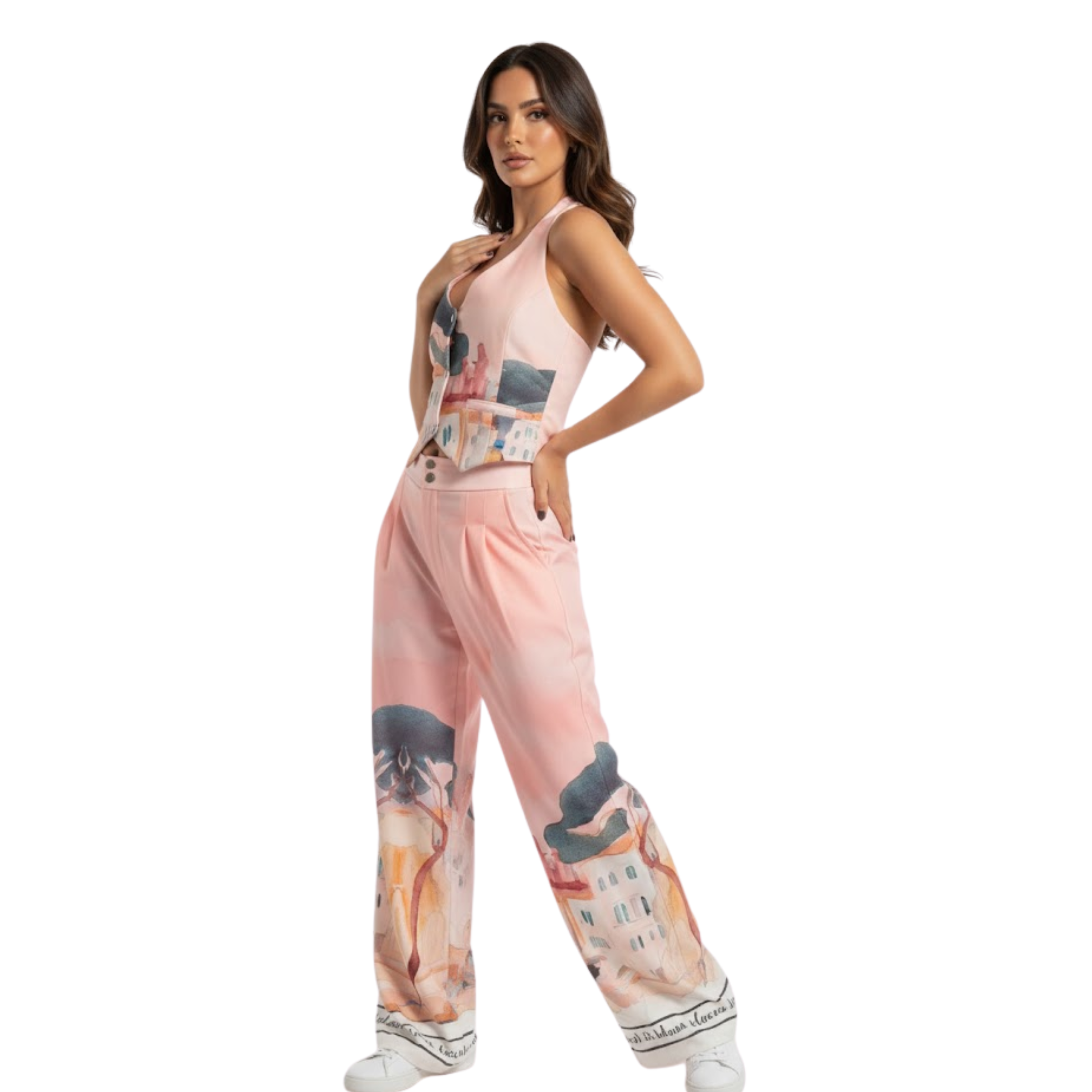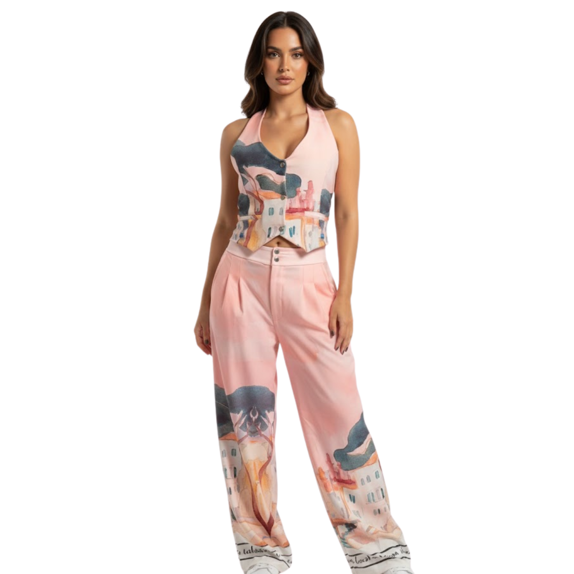 Conjunto sublimado, de chaleco con botones y nudo en cuello, y pantalón de broche con sublimación localizada