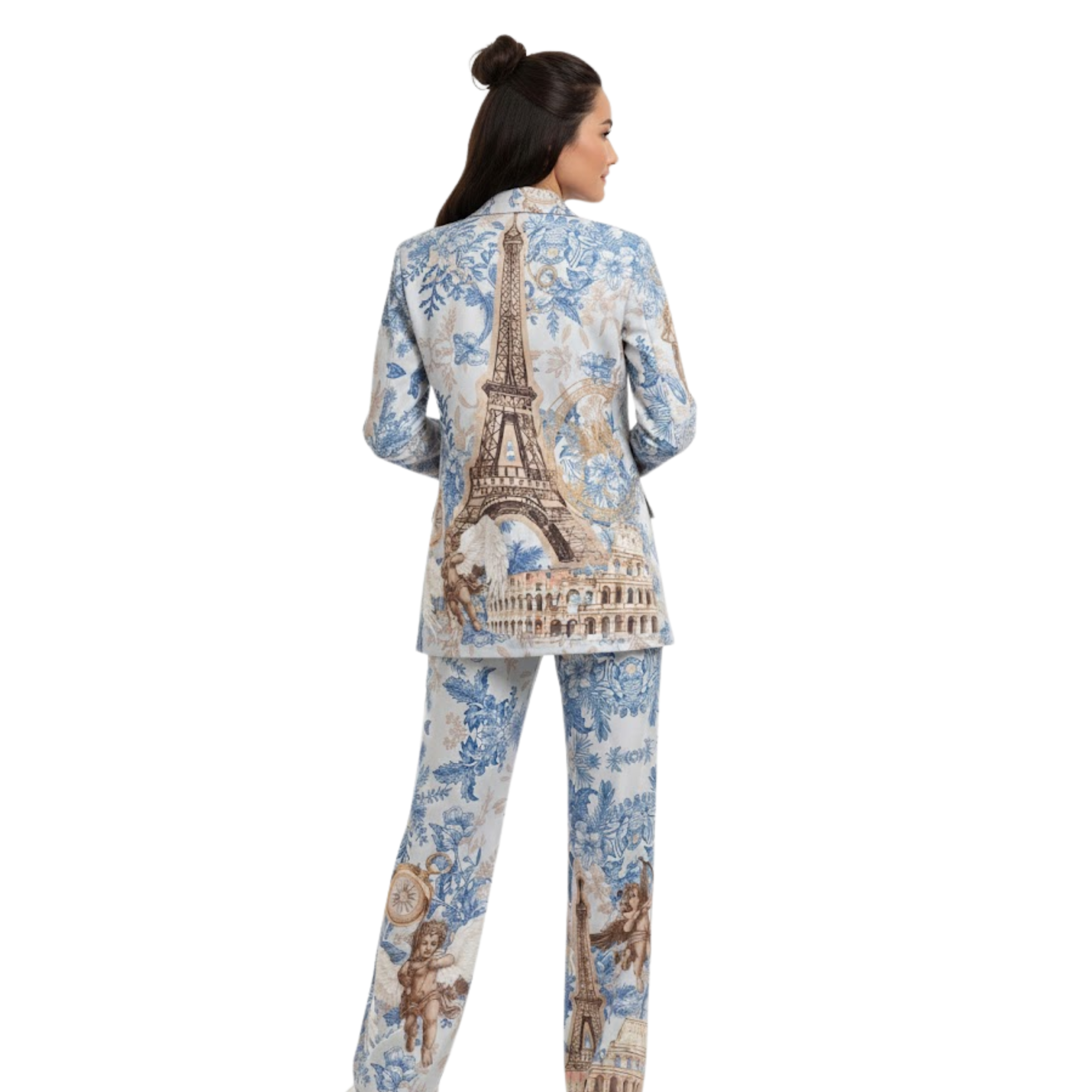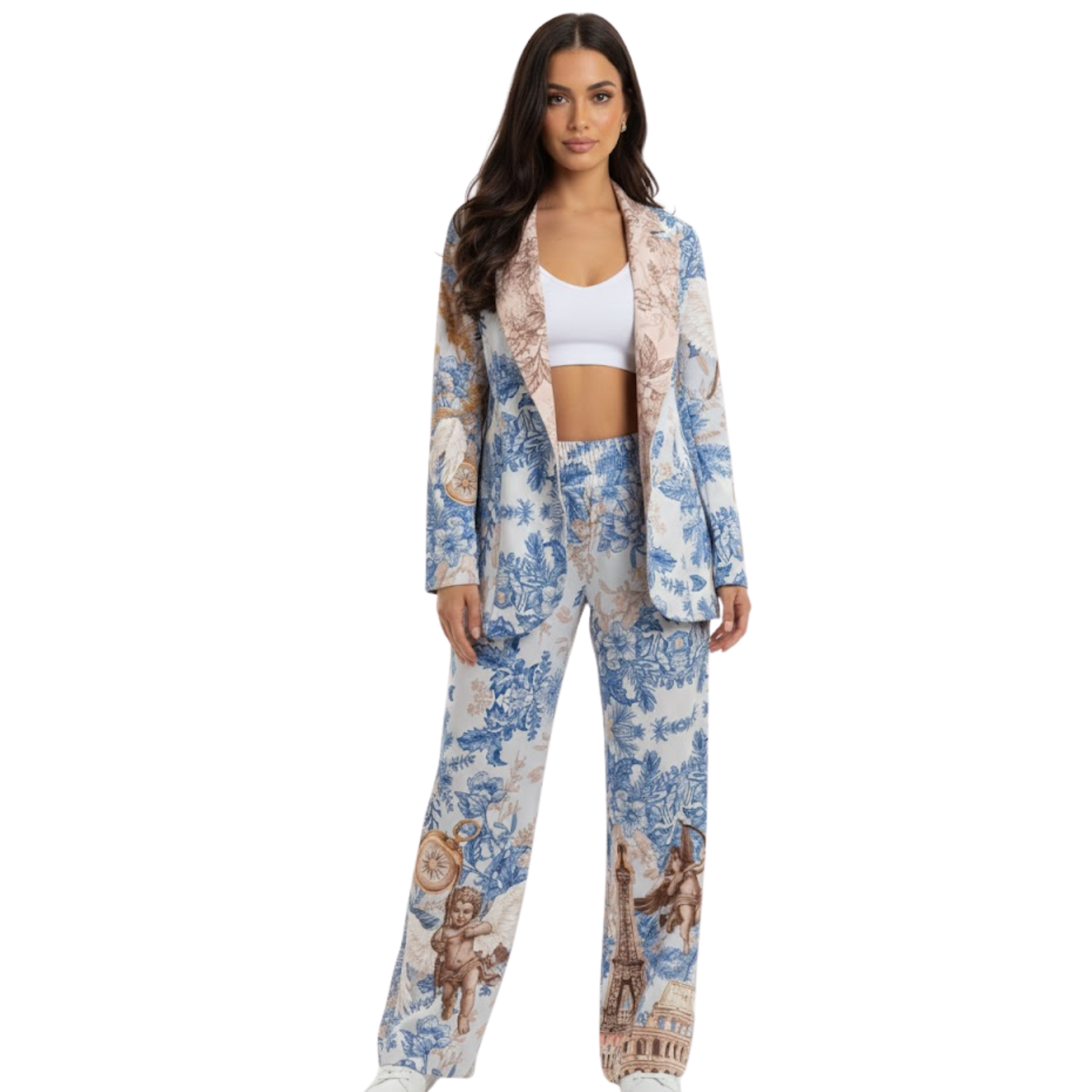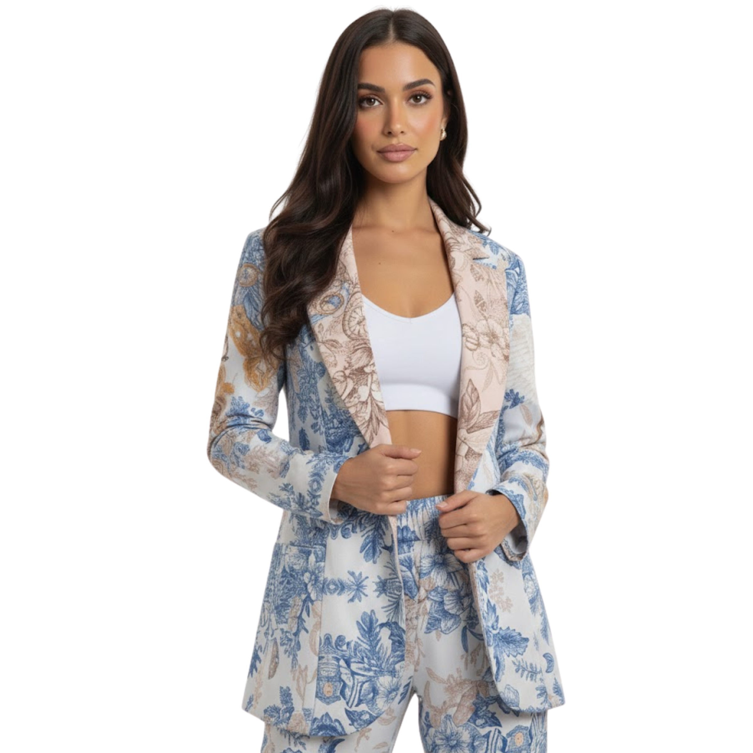 Conjunto de blazer y pantalón con pretina preparada con sublimación localizada.