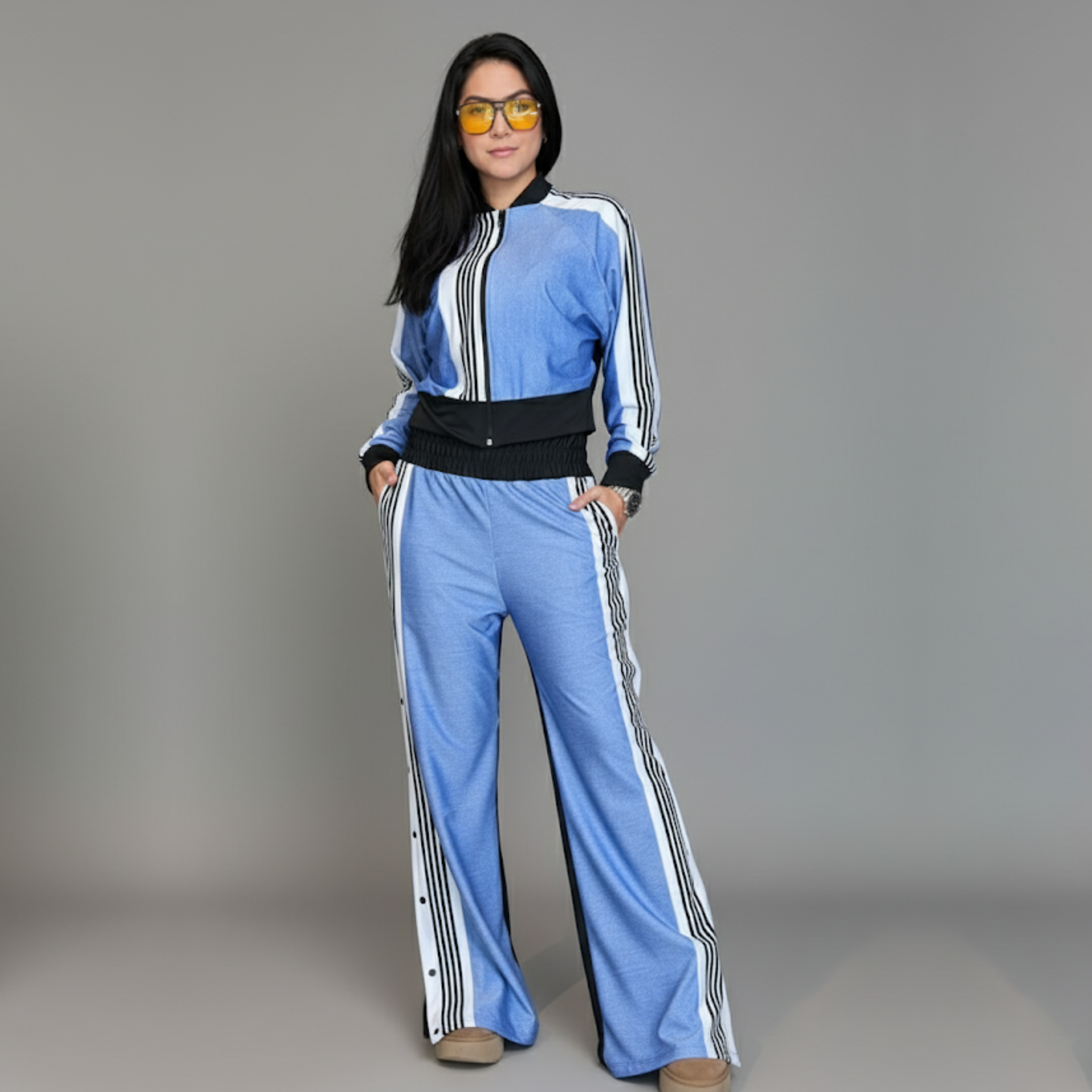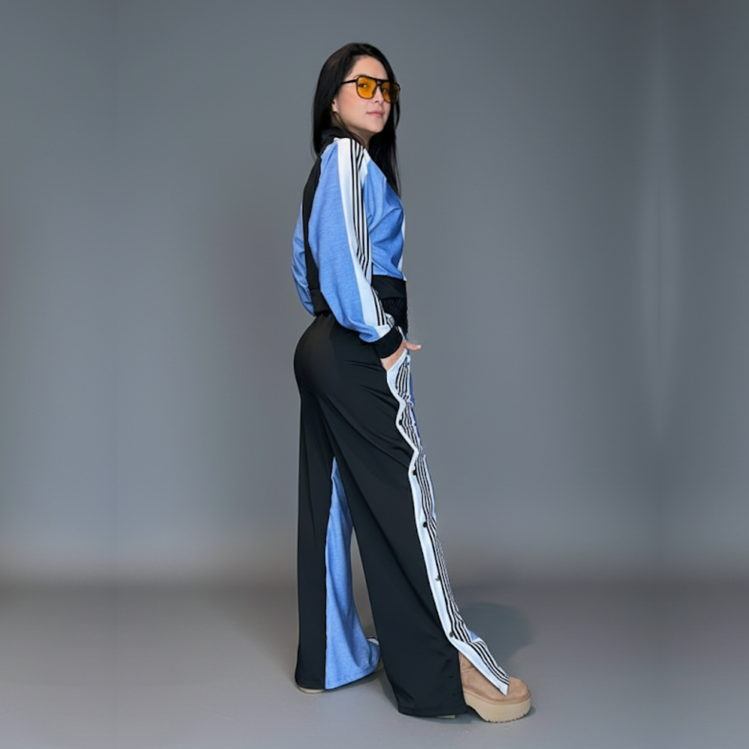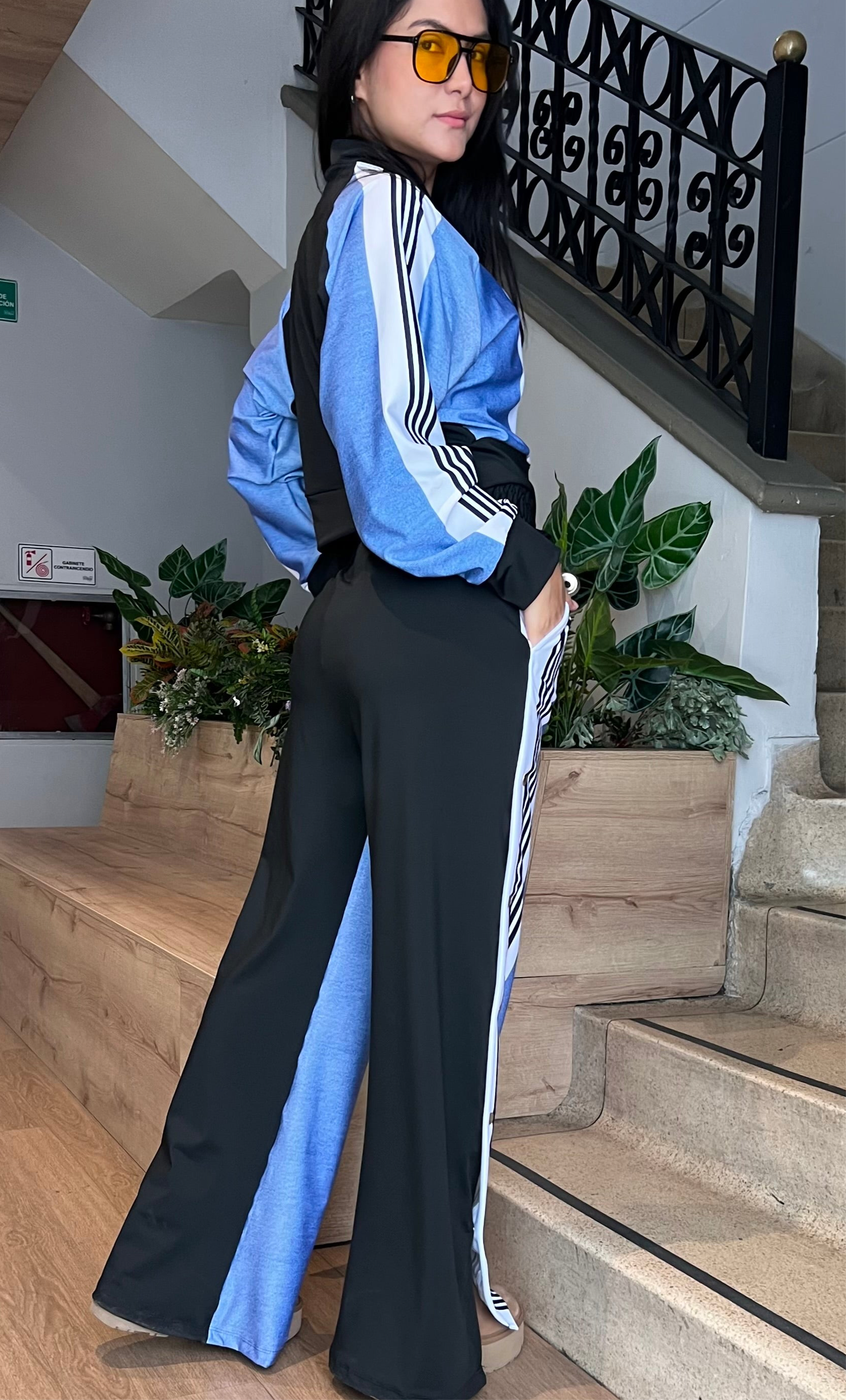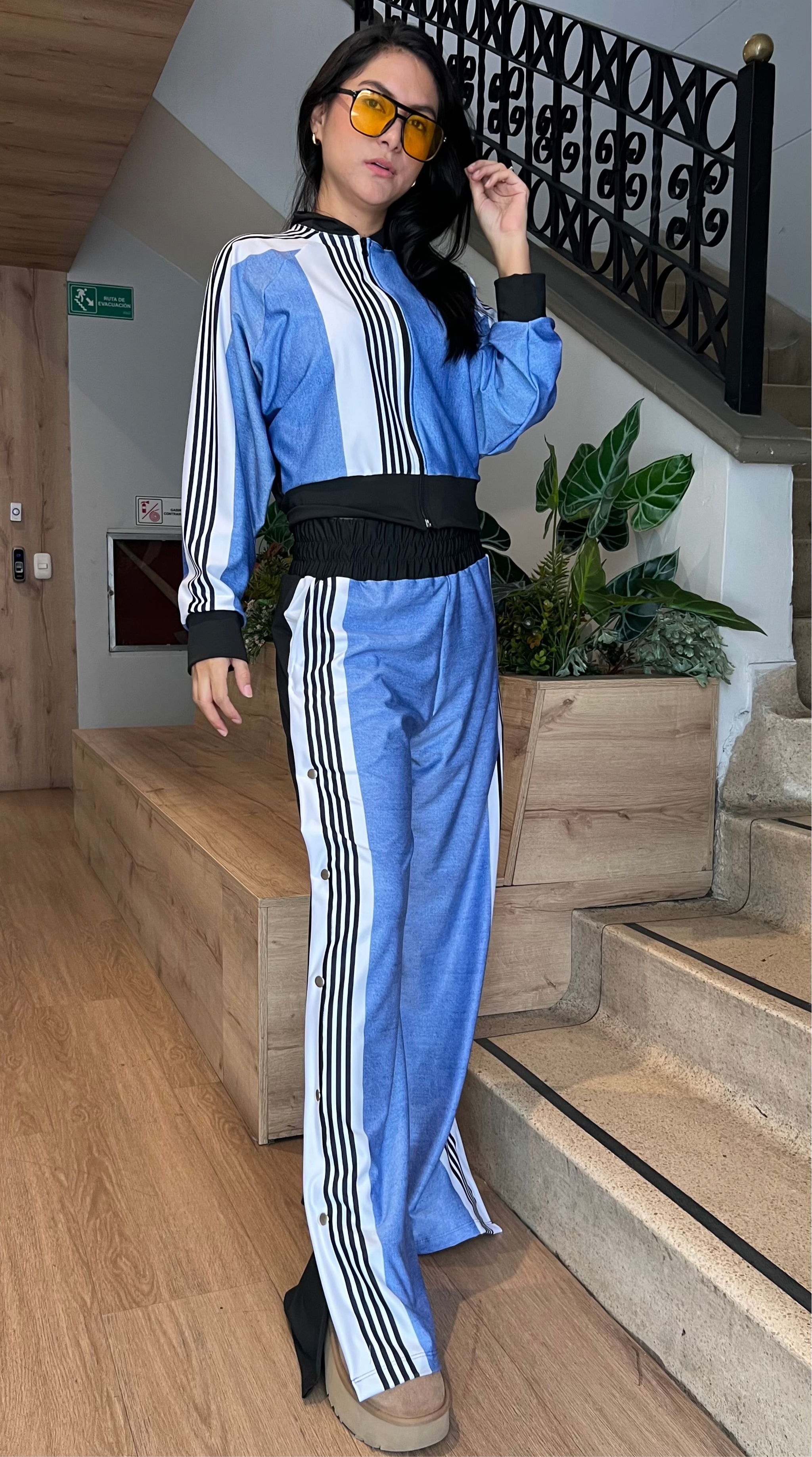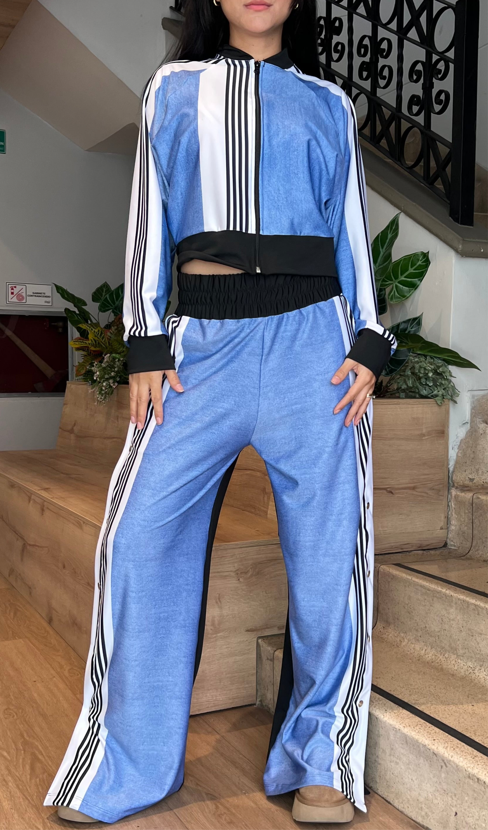 SET VIAJERO RAYAS Y ESTAMPADO EN MEZCLILLA