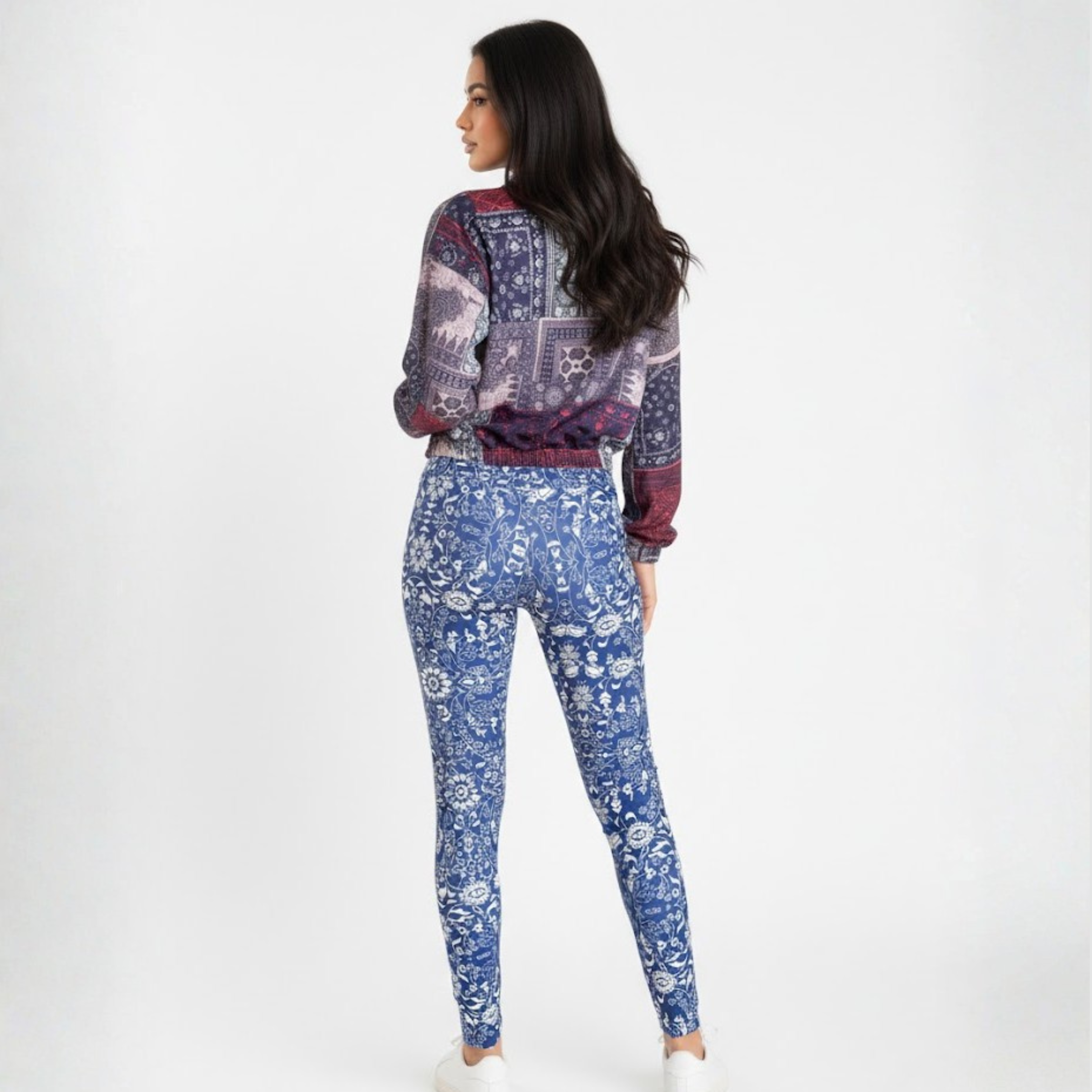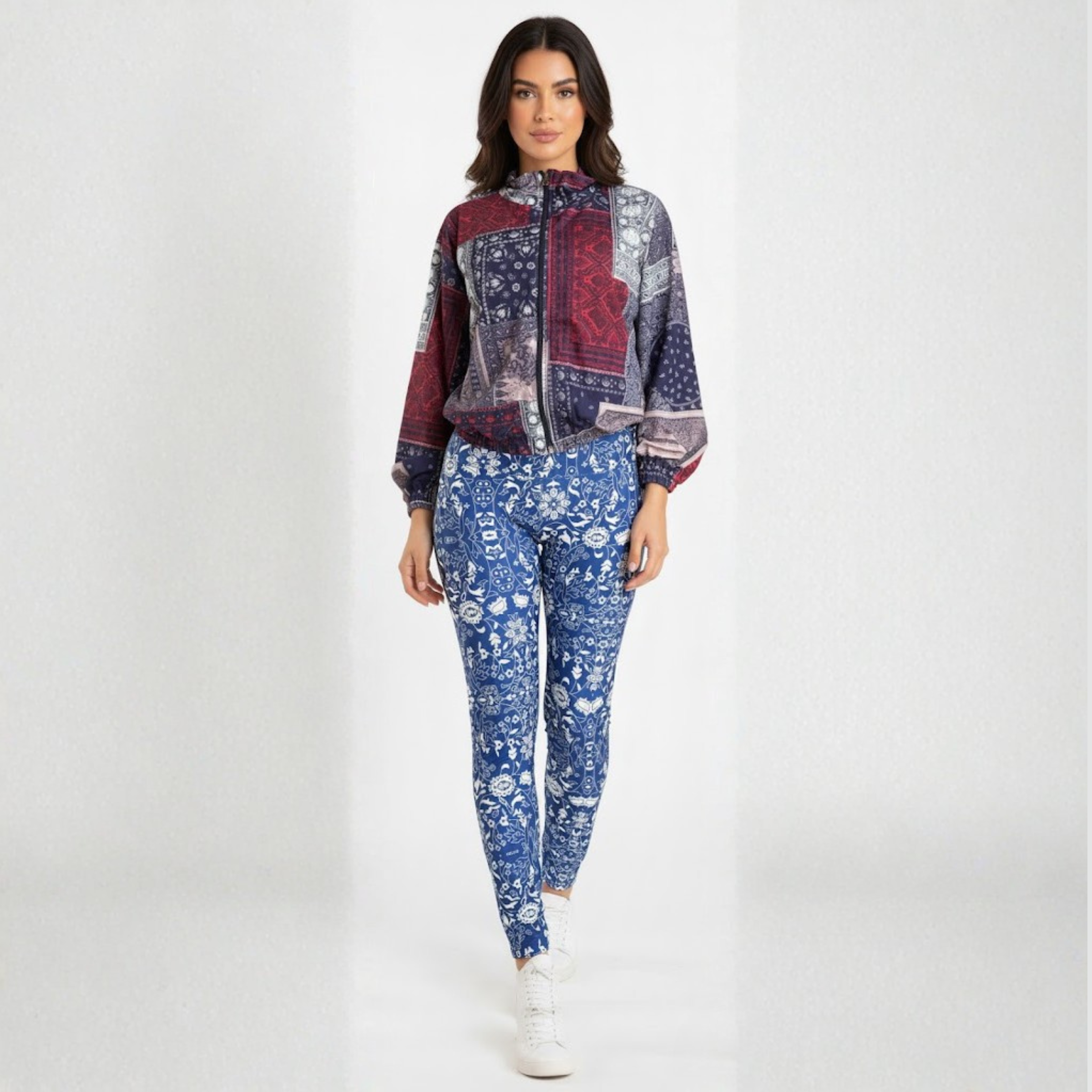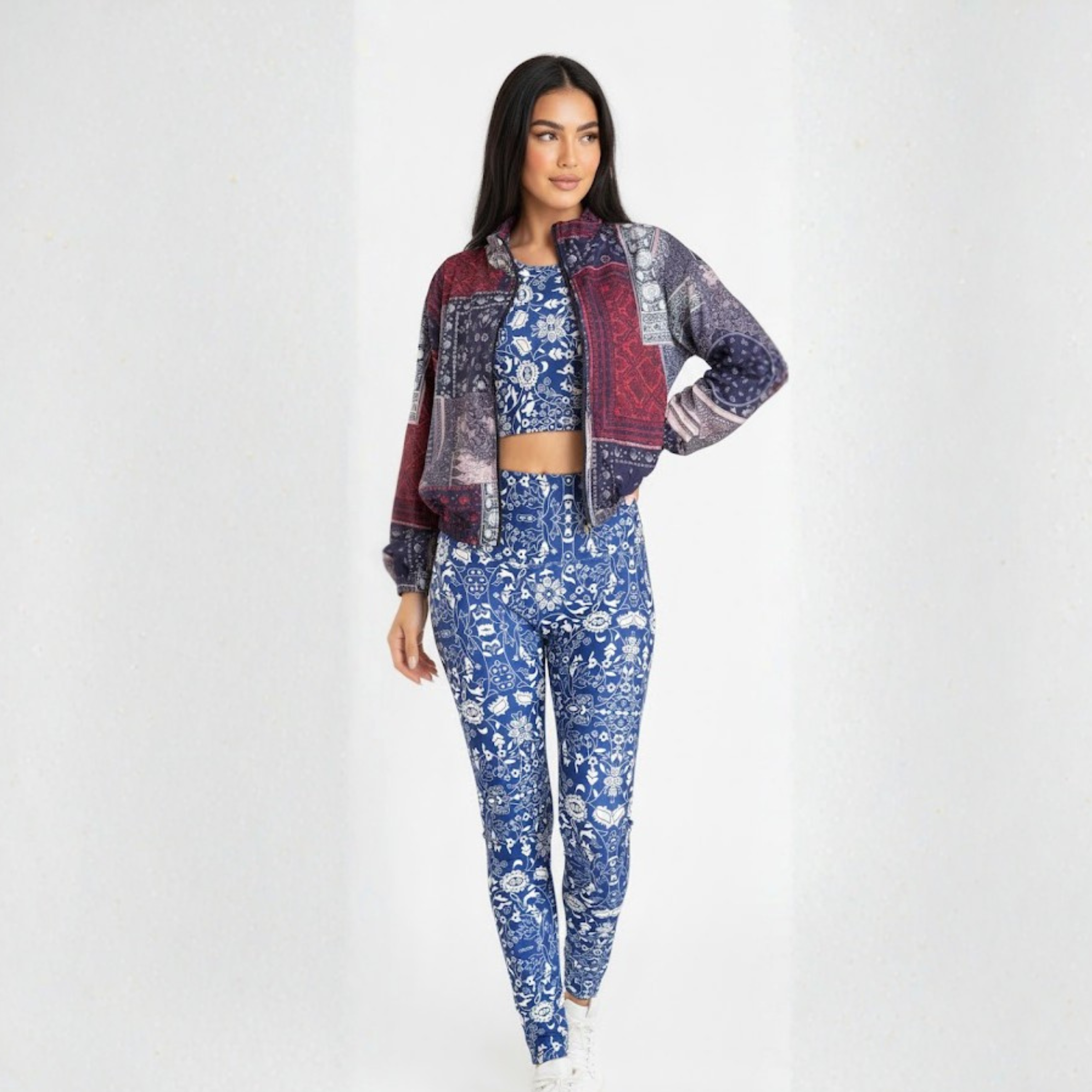 Trio de chaqueta, leggins y top con estampación localizado, el leggins esta elaborado en una licra de 400gr y la chaqueta y el top en una licra de 200gr