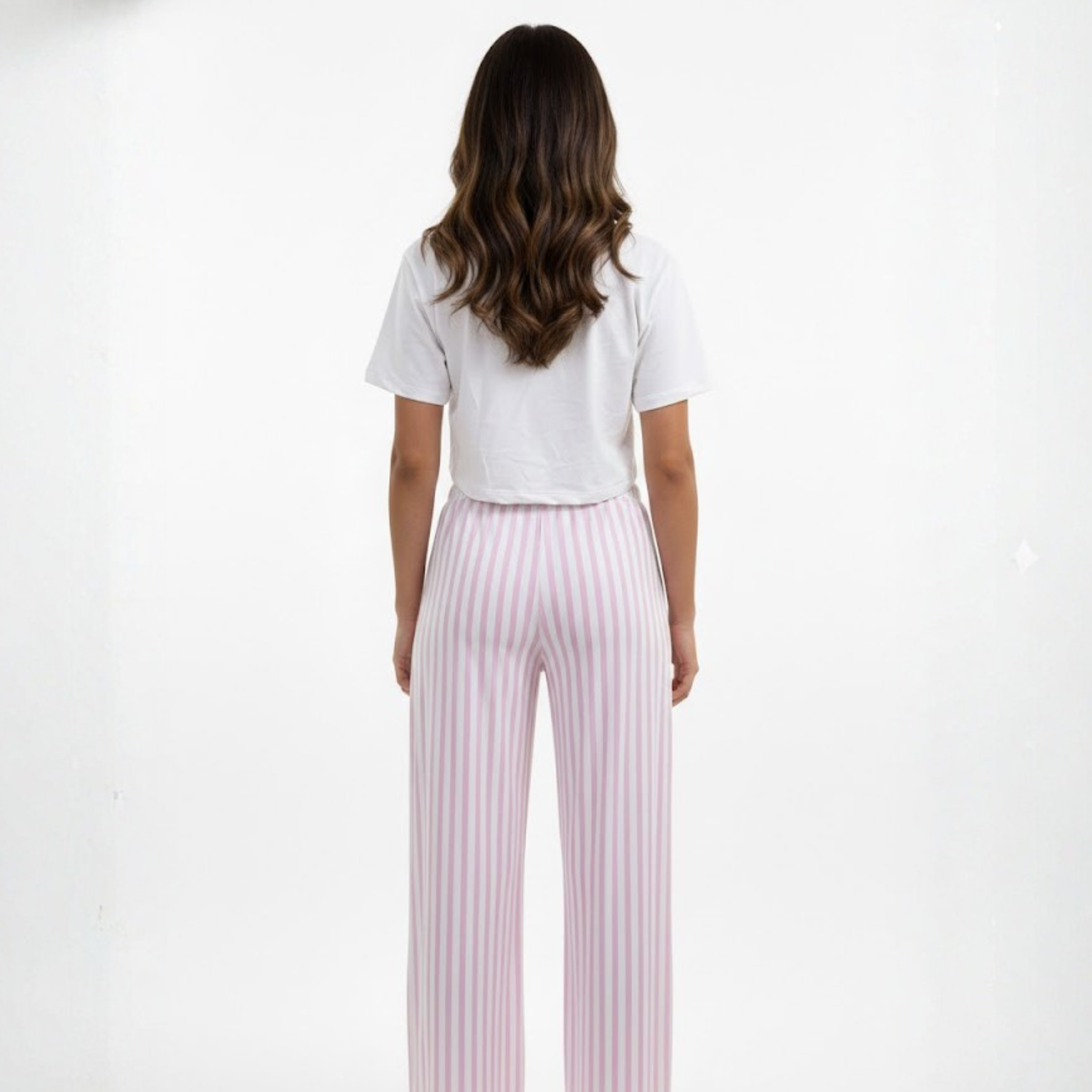 Pijama de dos piezas en tonos blanco y rosado, compuesta por una camiseta corta de manga corta con estampado frontal rosado que simula un diseño de encaje, combinada con un pantalón largo de corte amplio con rayas verticales rosadas y blancas