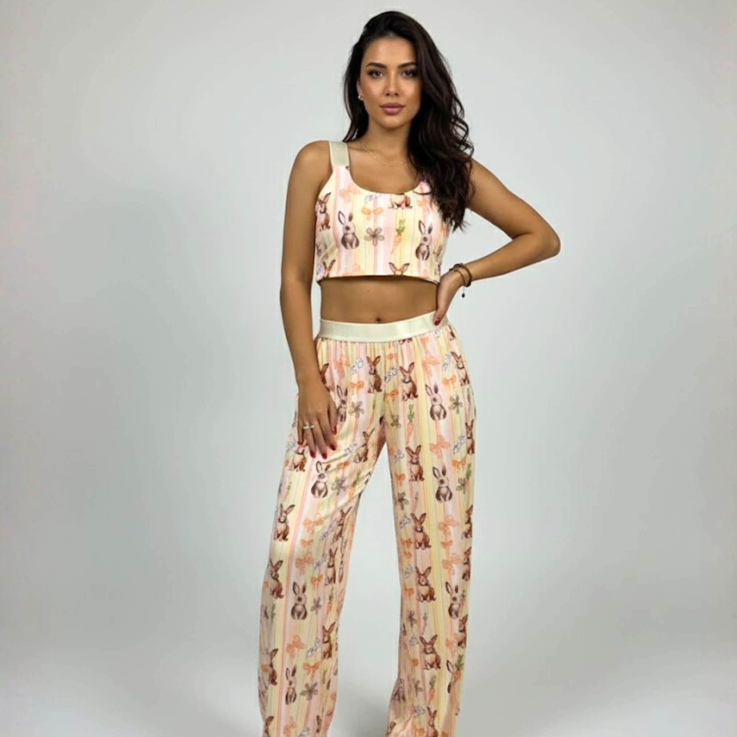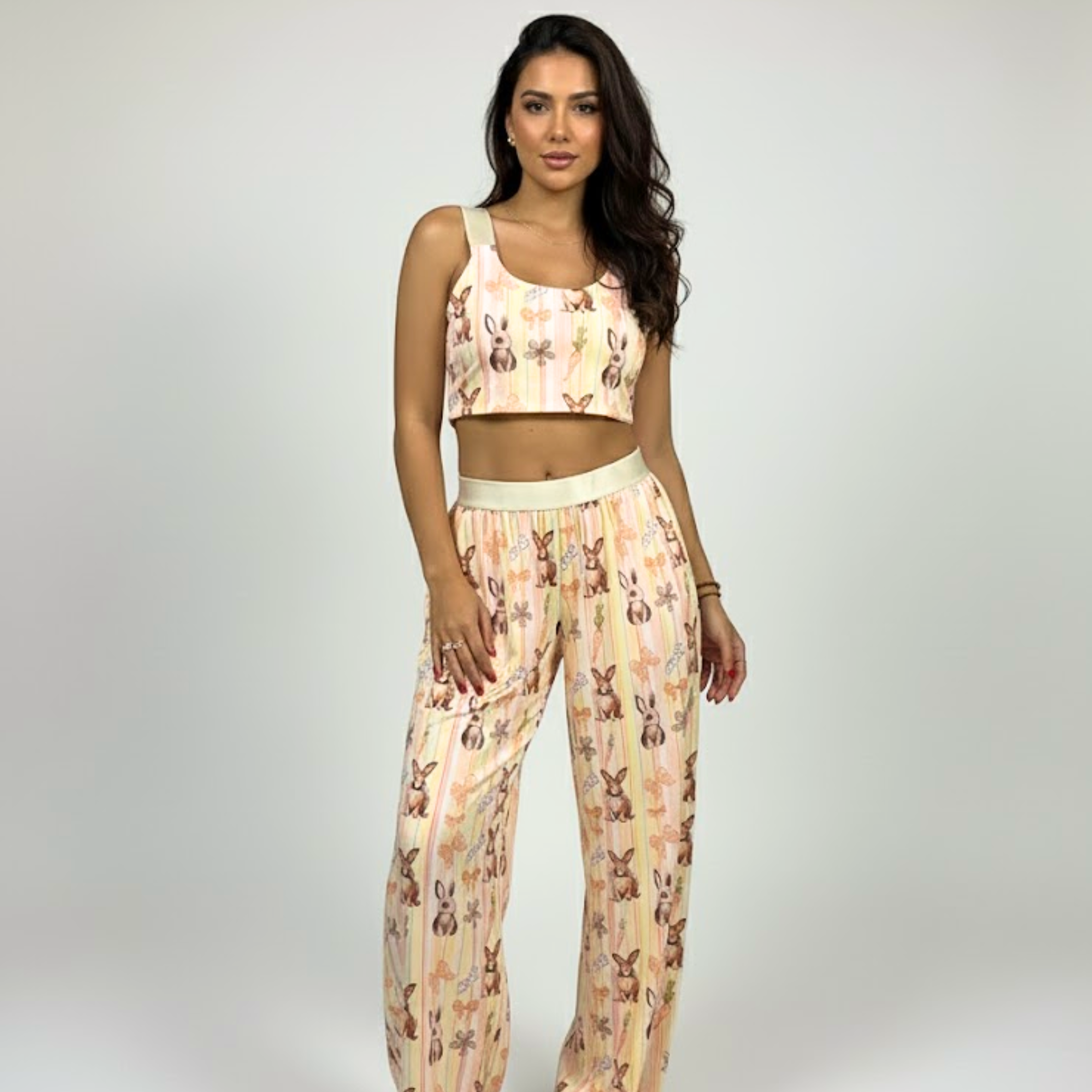 Pijama de dos piezas compuesta por top con elástico sublimado y pantalón con elástico en pretina. Diseñada en tela fresca, cómoda y liviana que brinda suavidad y libertad de movimiento, ideal para acompañar tus noches de descanso.