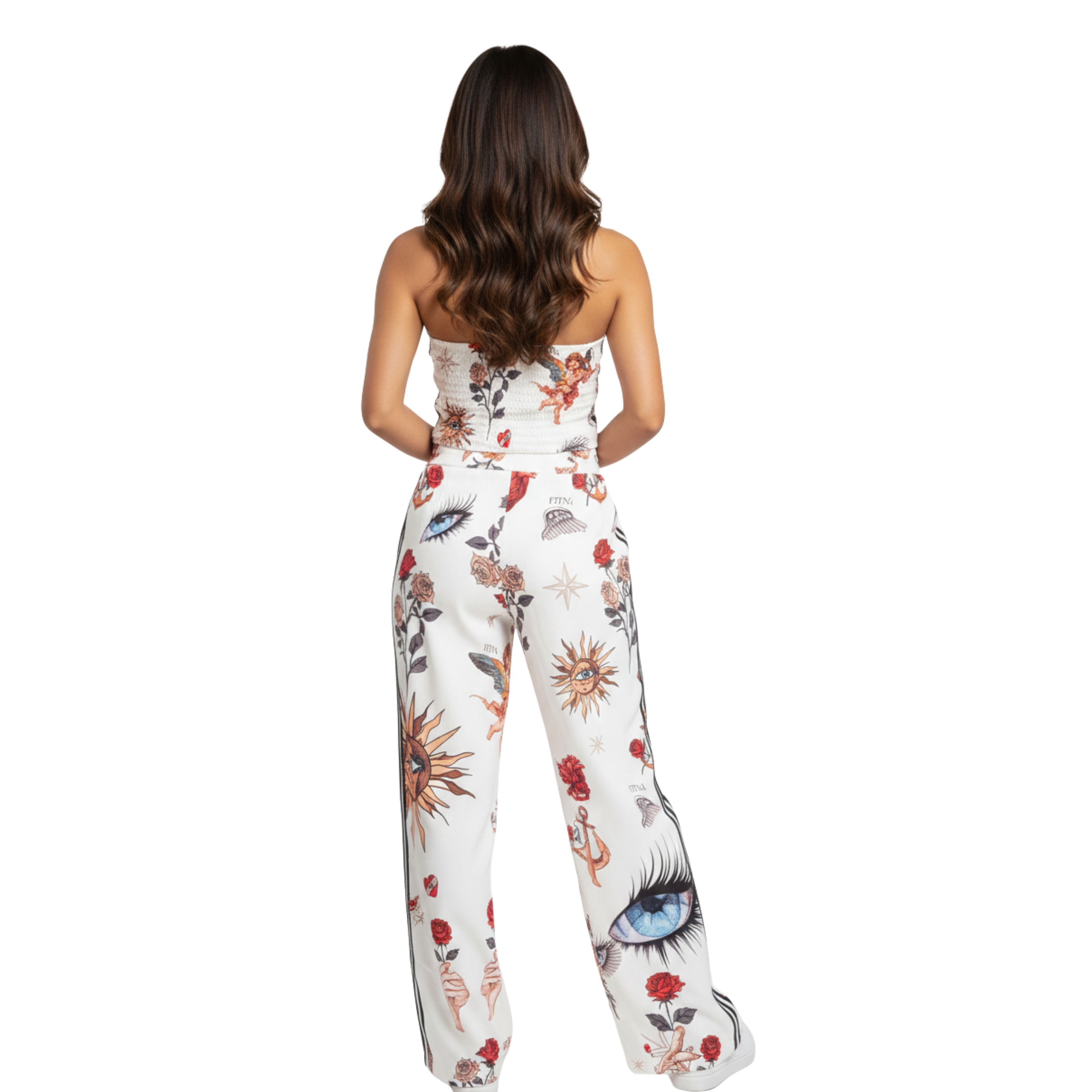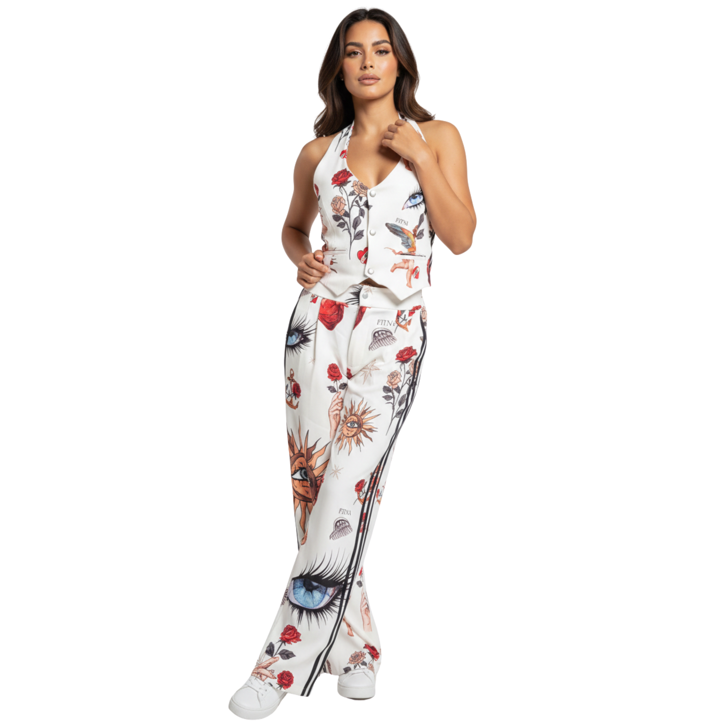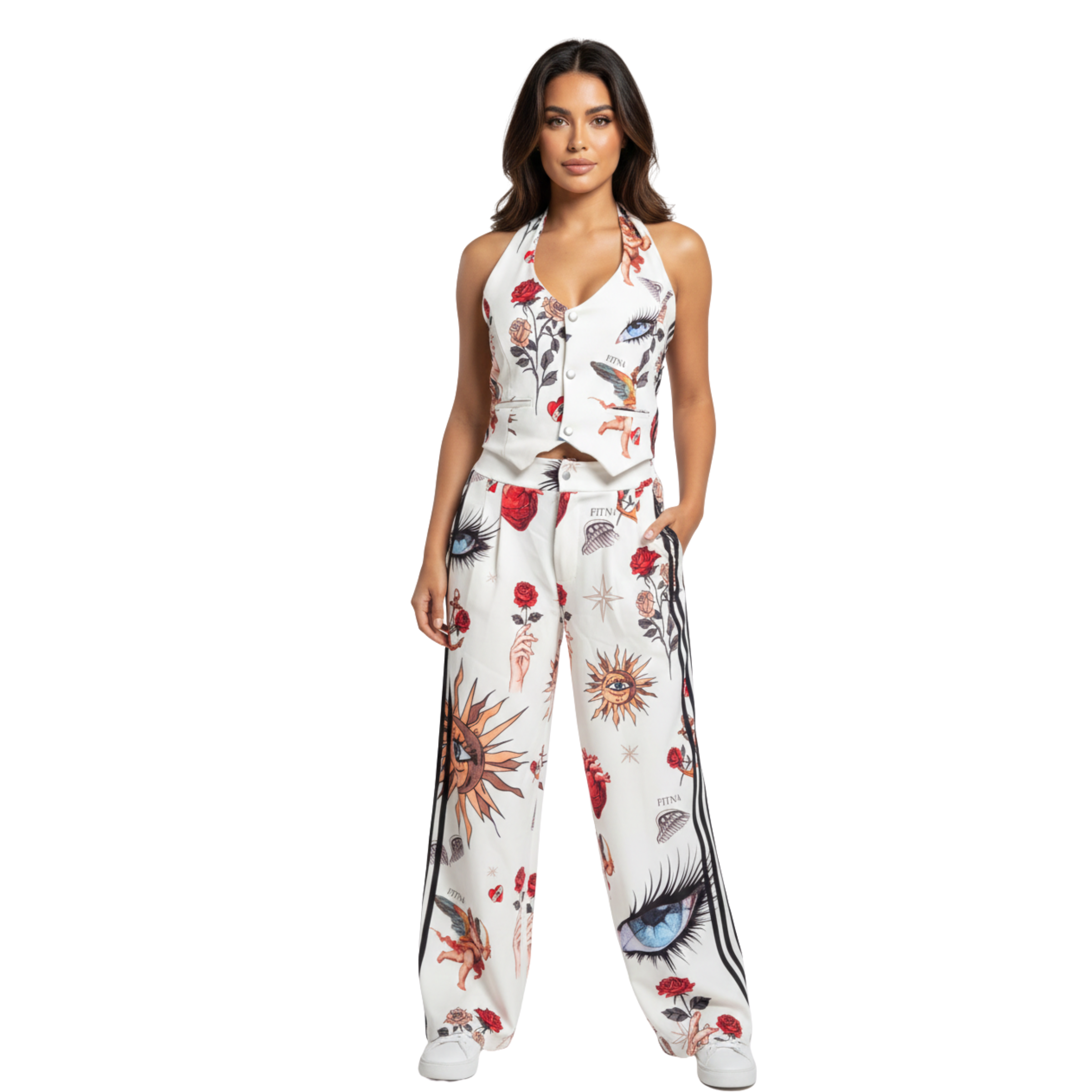 Conjunto sublimado, de chaleco con botones y nudo en cuello, y pantalón de broche con sublimación localizada