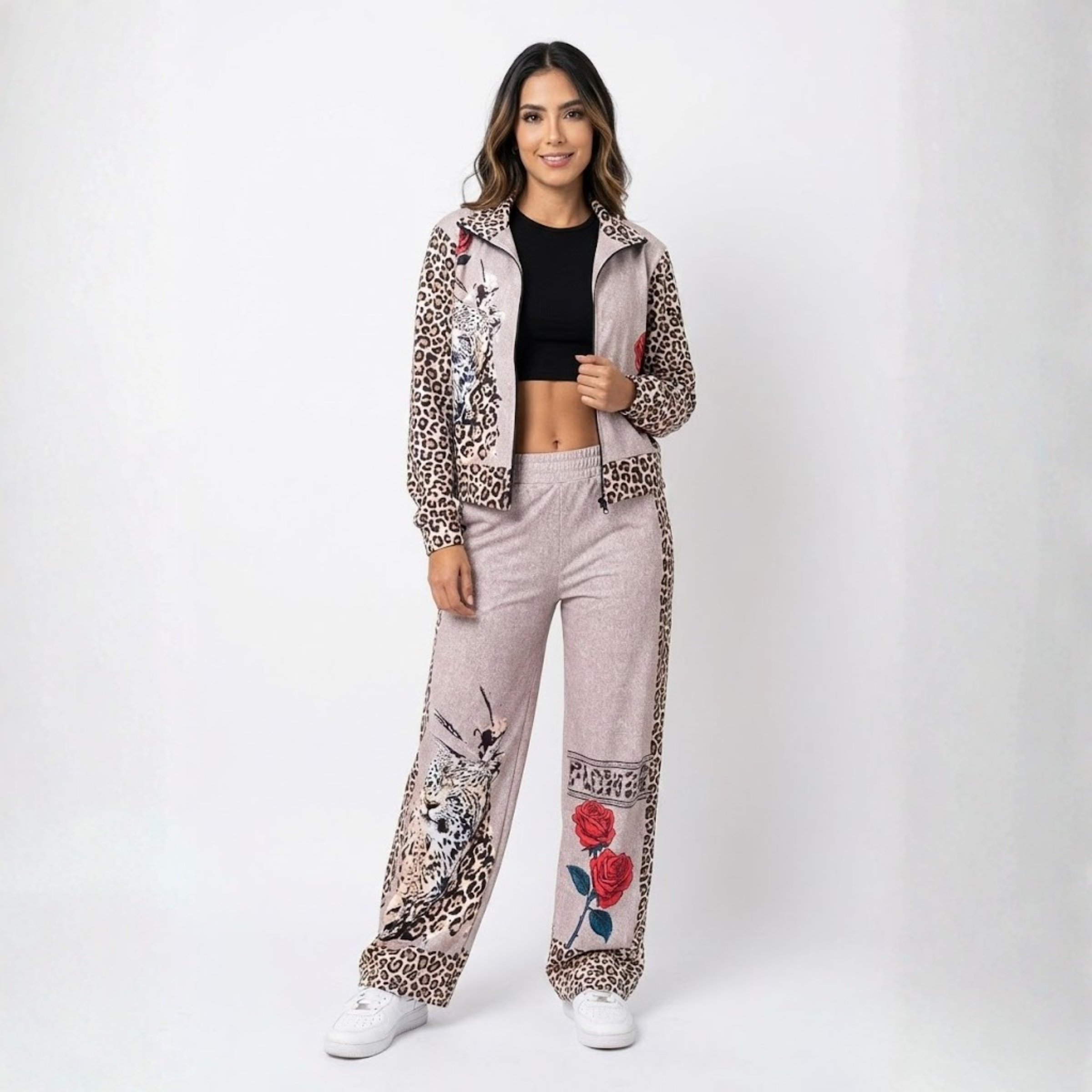 CONJUNTO DE CHAQUETA Y PANTALÓN CON PRETINA LISA Y SUBLIMACIÓN LOCALIZADA tela licra con elongación