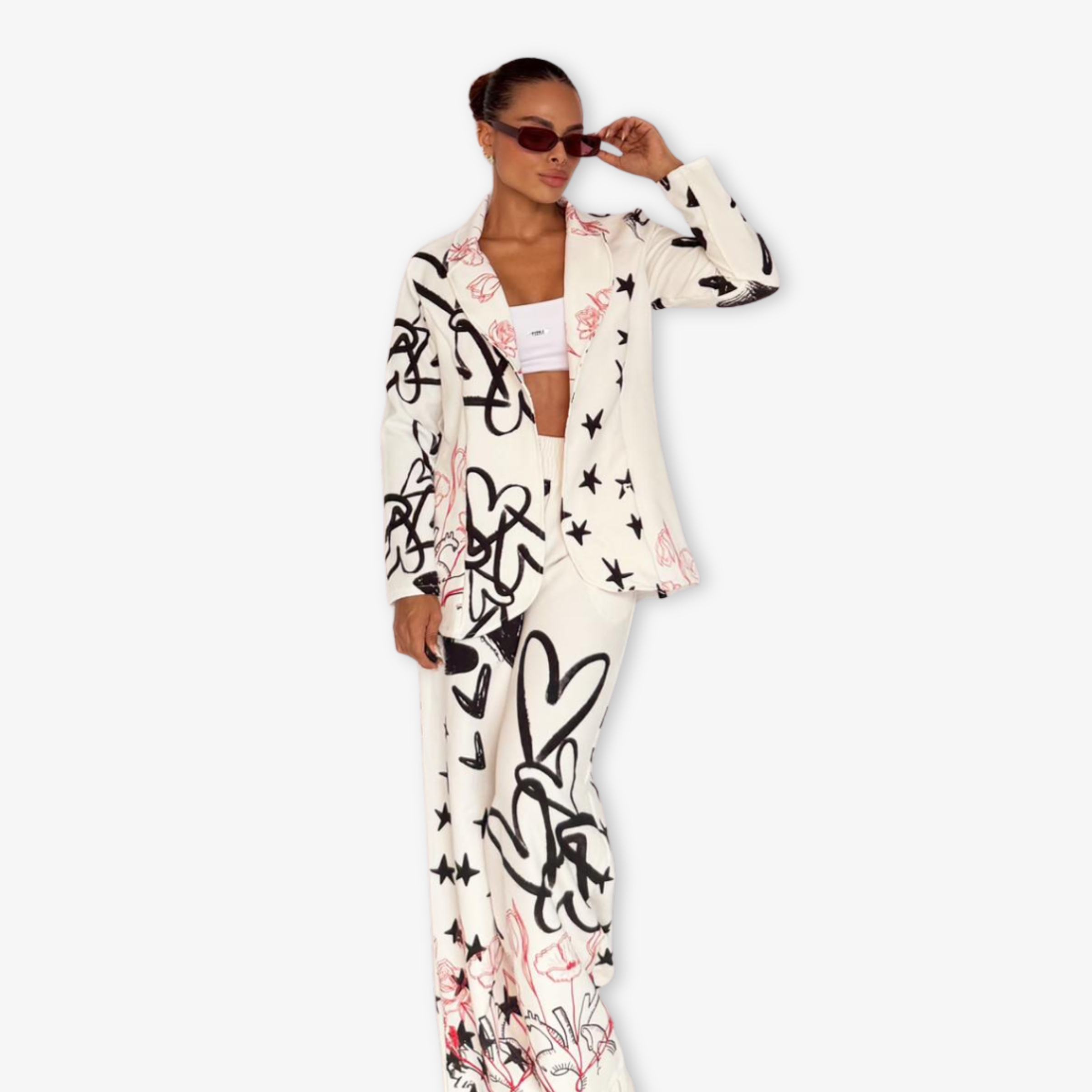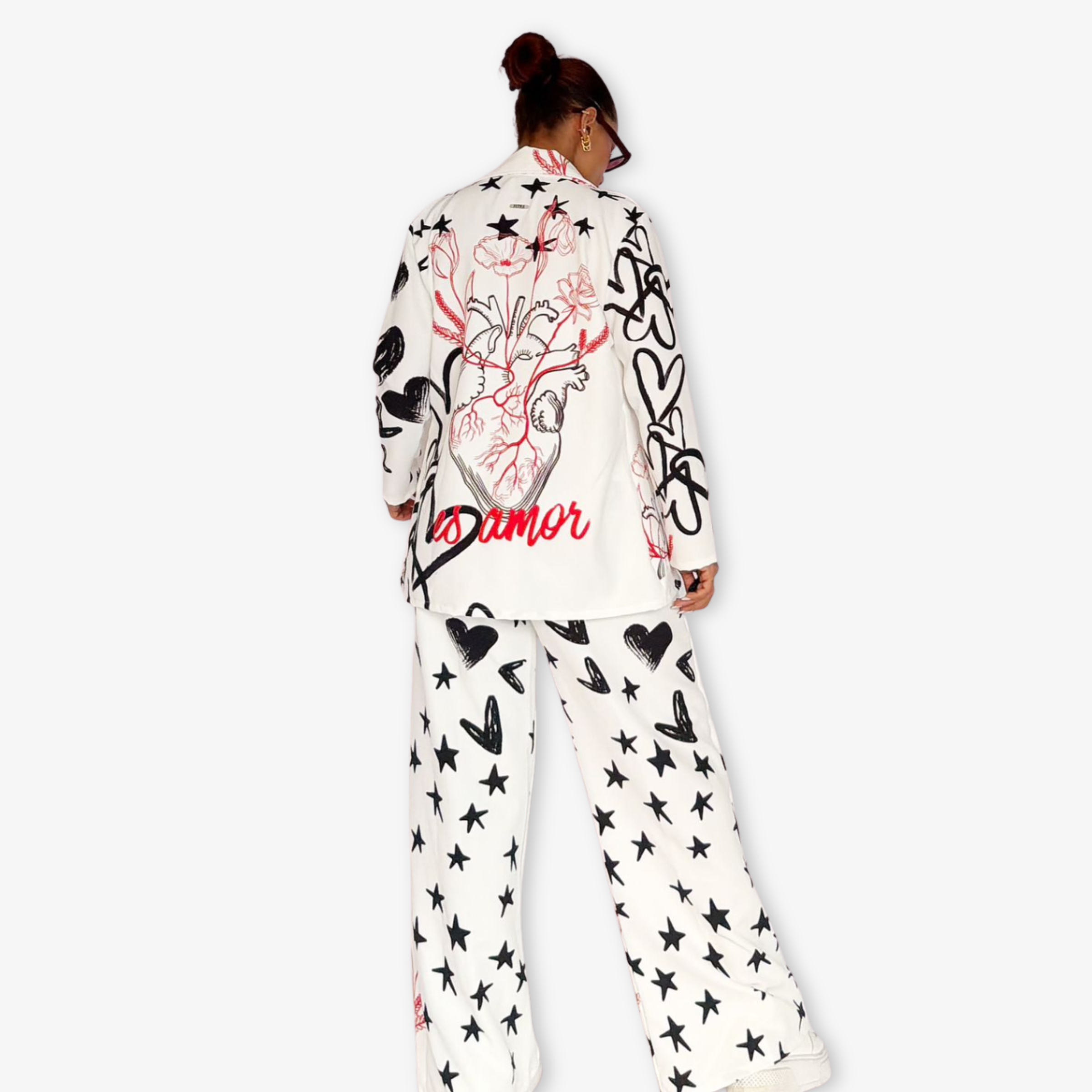 Conjunto de blazer y pantalón con pretina preparada con sublimación localizada.