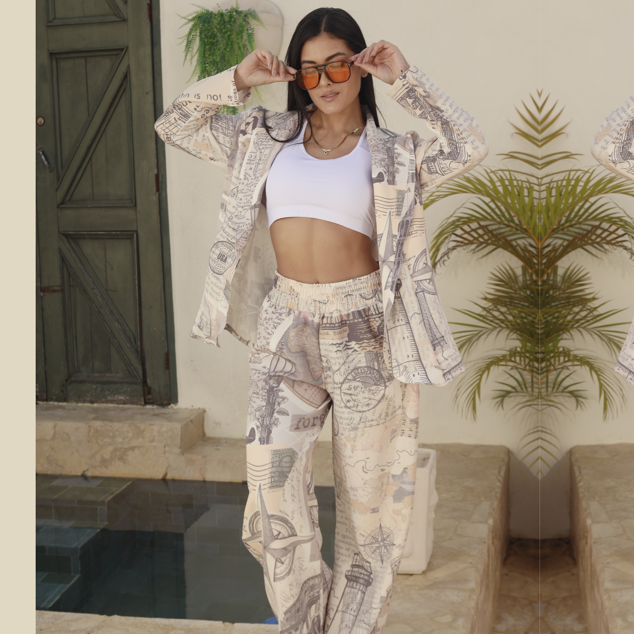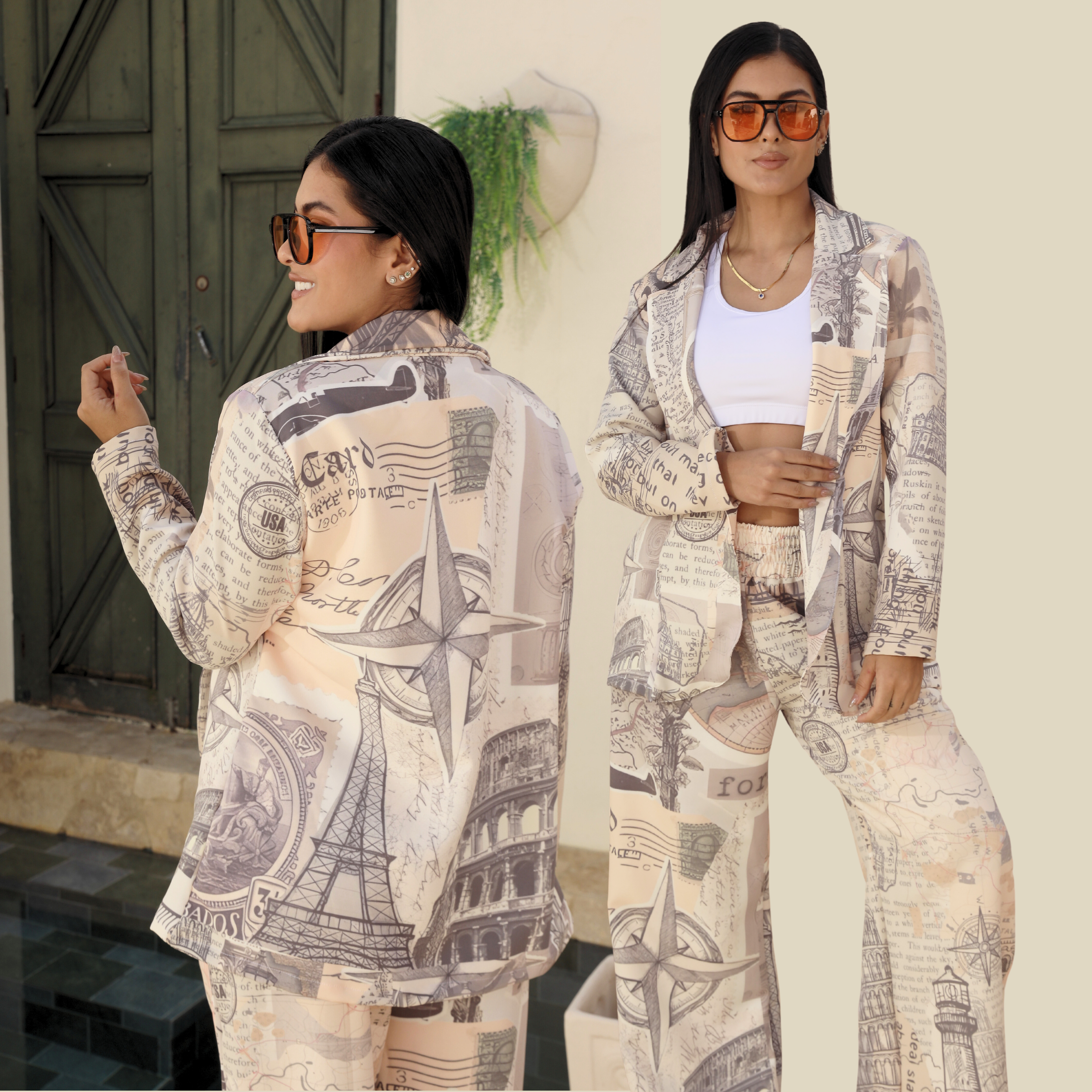 Set de blazer y pantalón sublimado con elementos de historia y viajes.