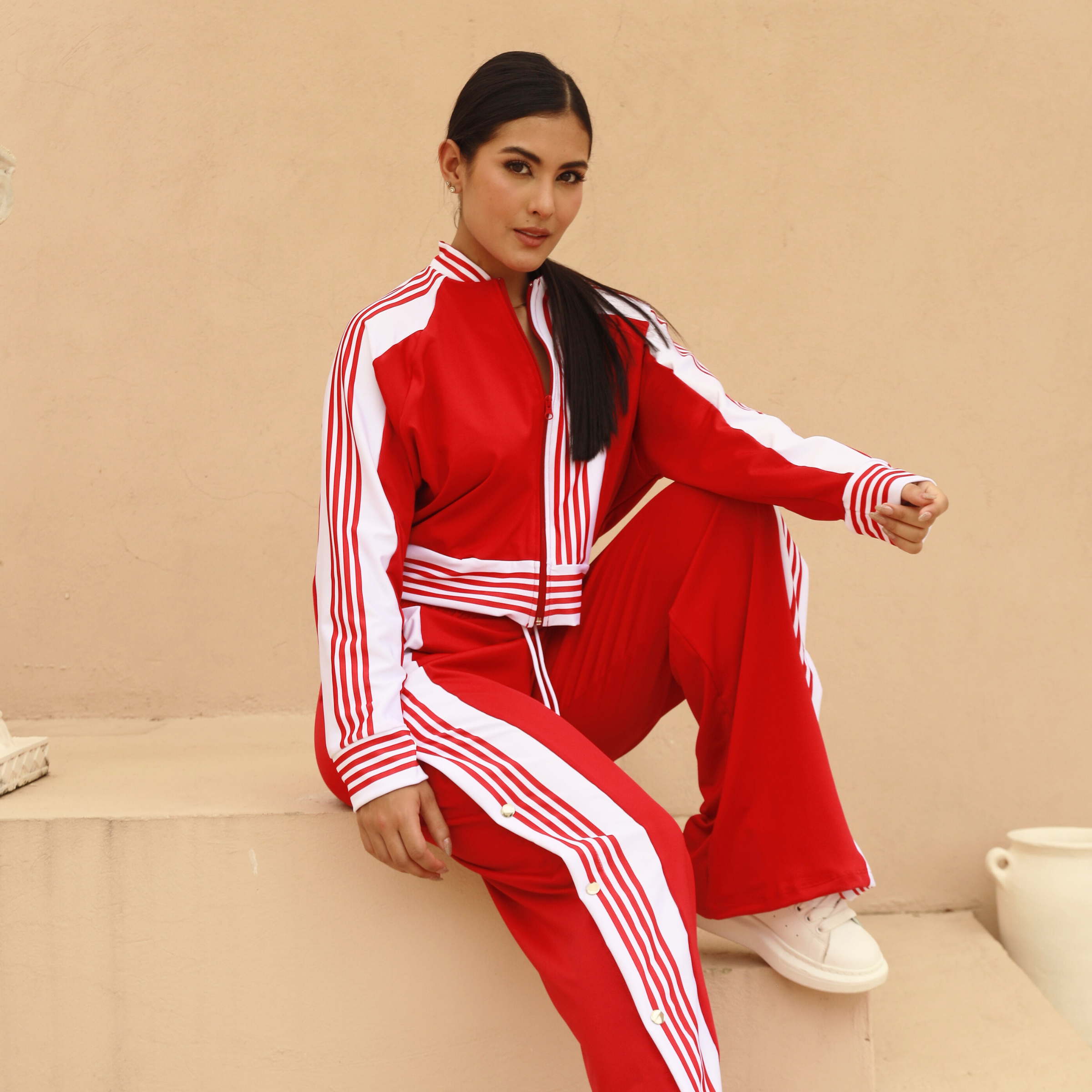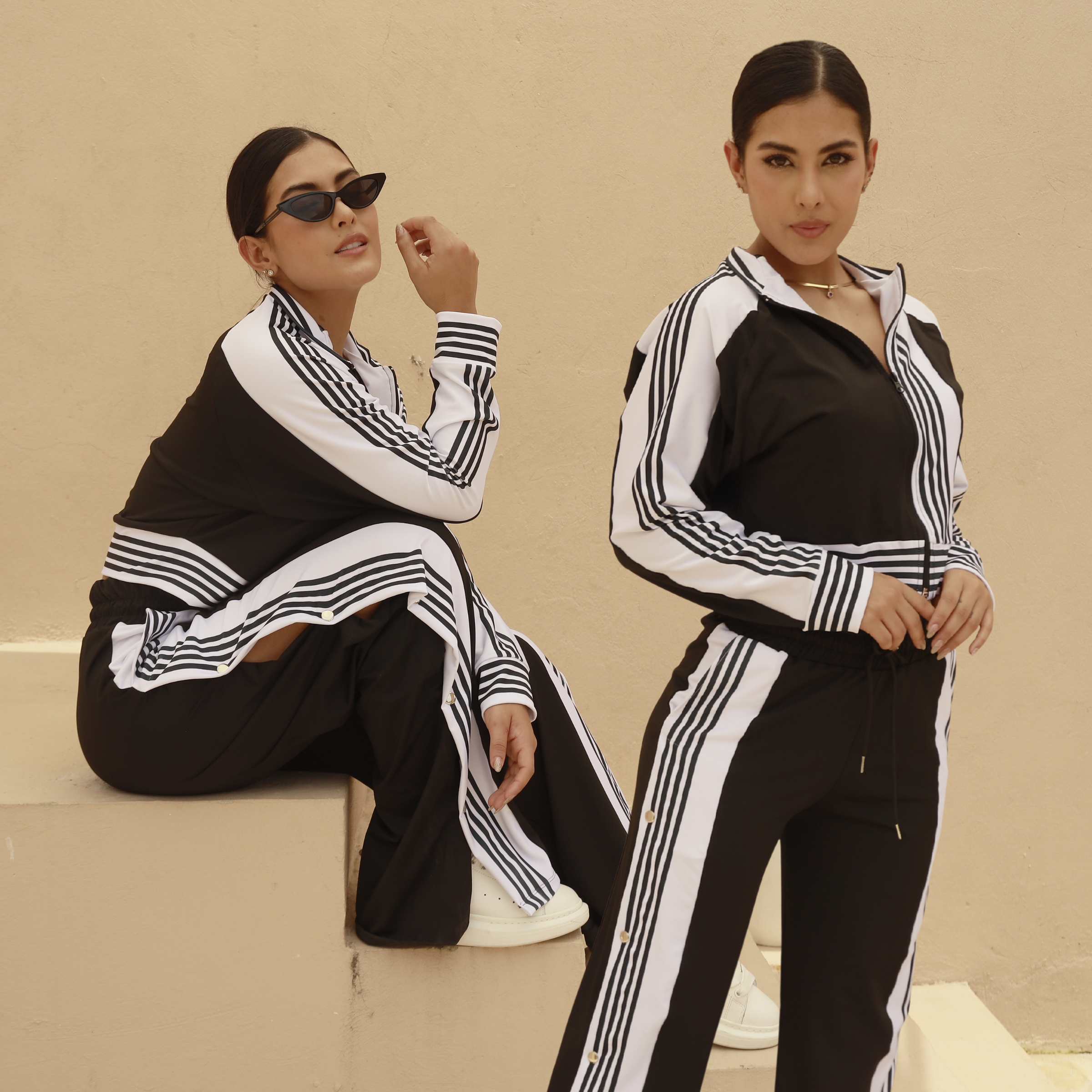Set de chaqueta con cierre y cortes con sublimado de líneas.