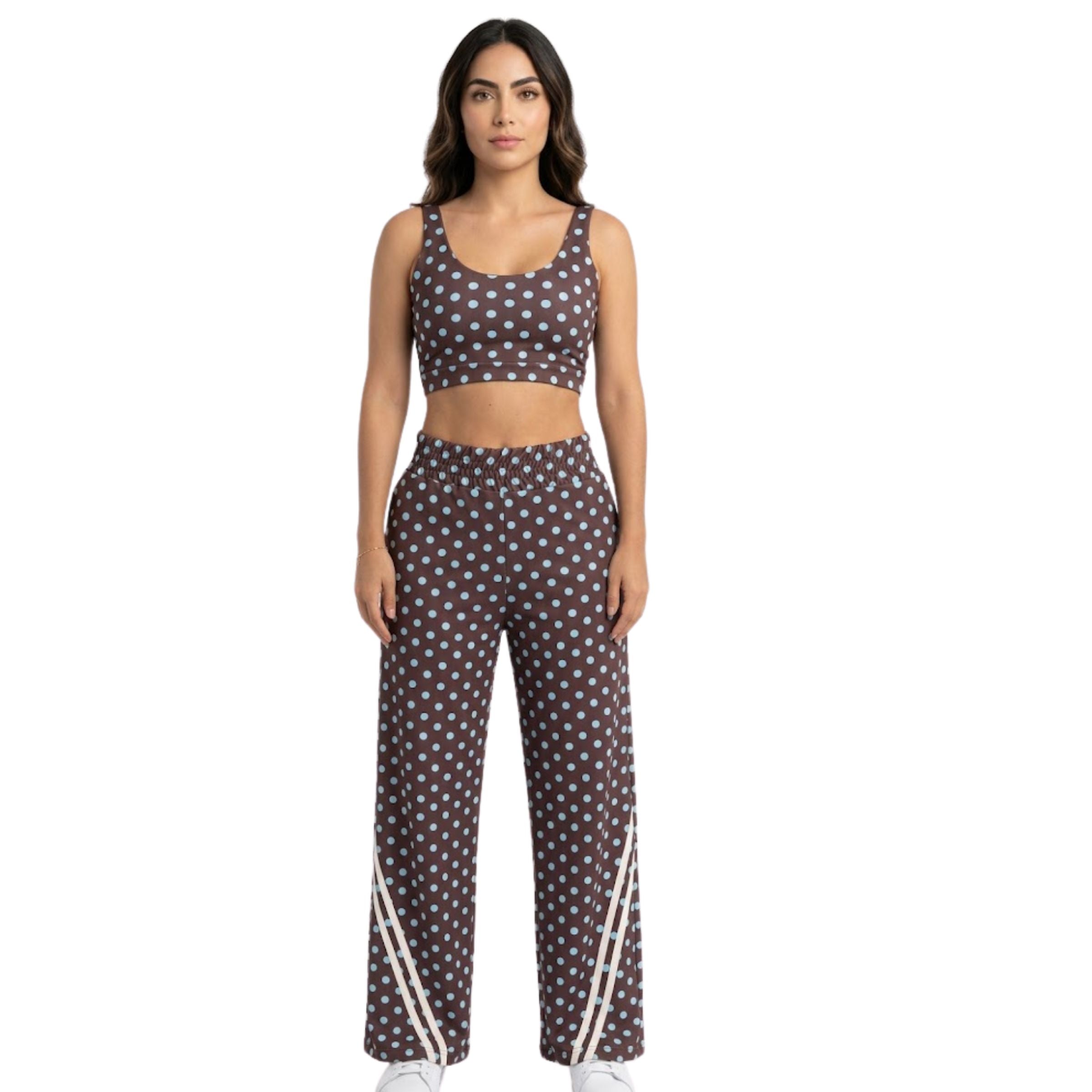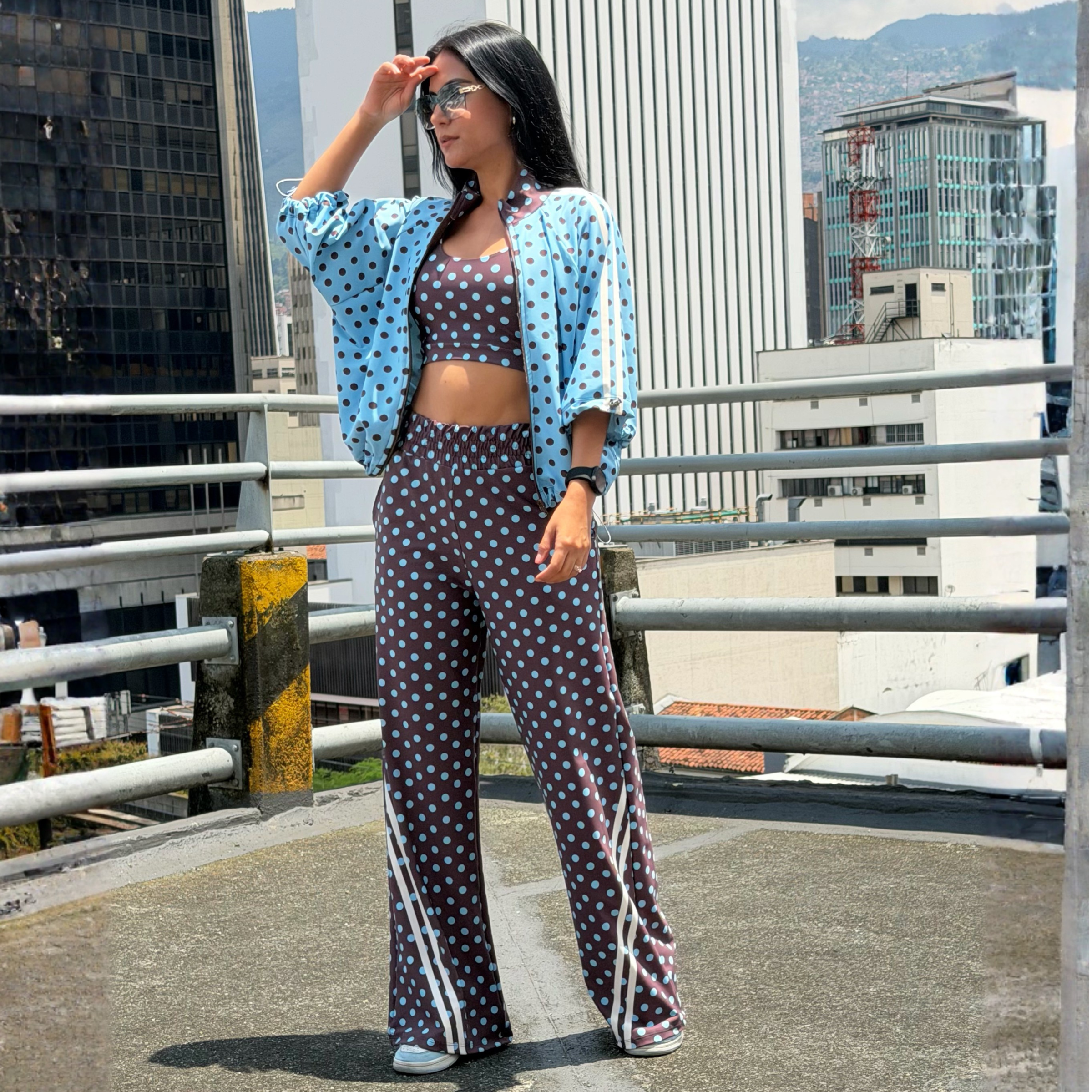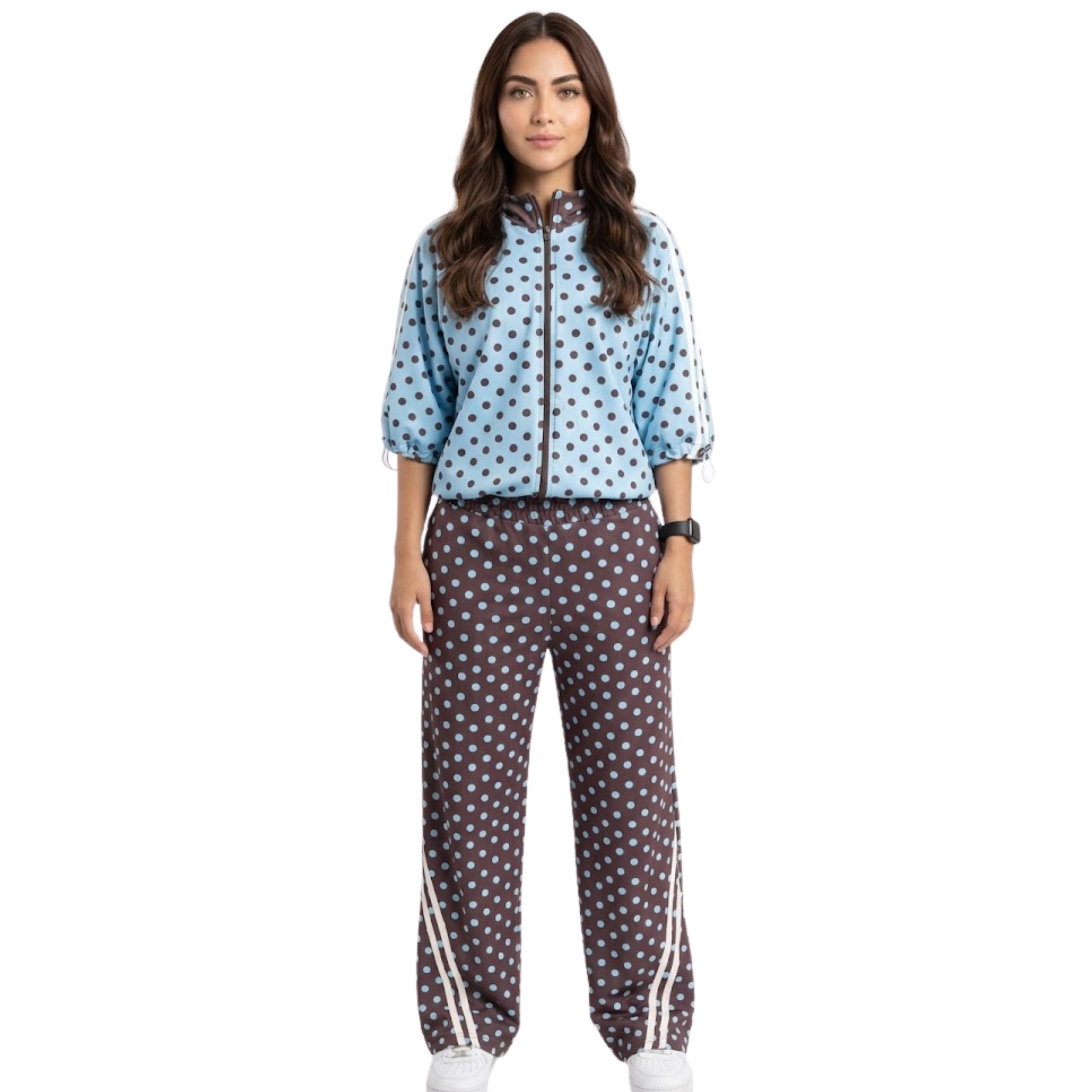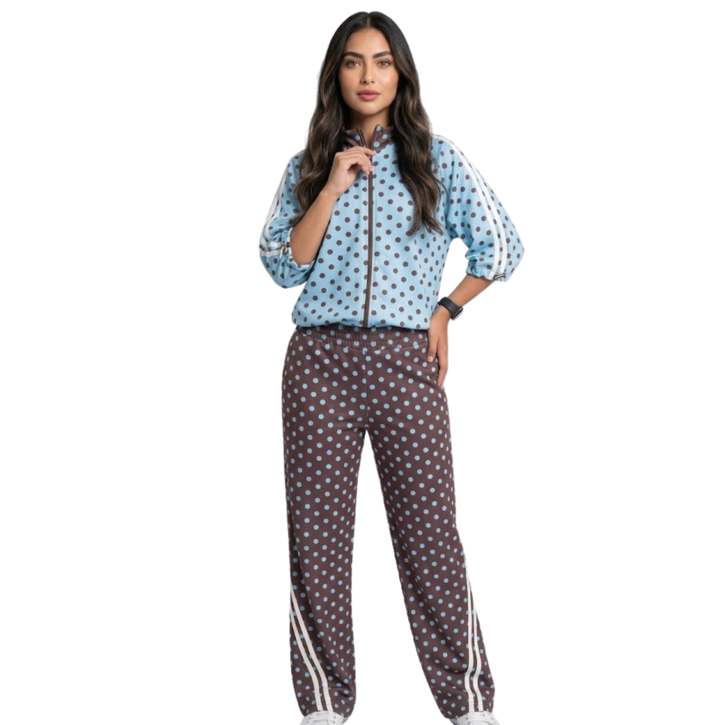Conjunto de chaqueta con cierre y líneas sublimadas en manga ranglan y pantalón con pretina preparada y líneas diagonales en bota, Set con estampado localizado.