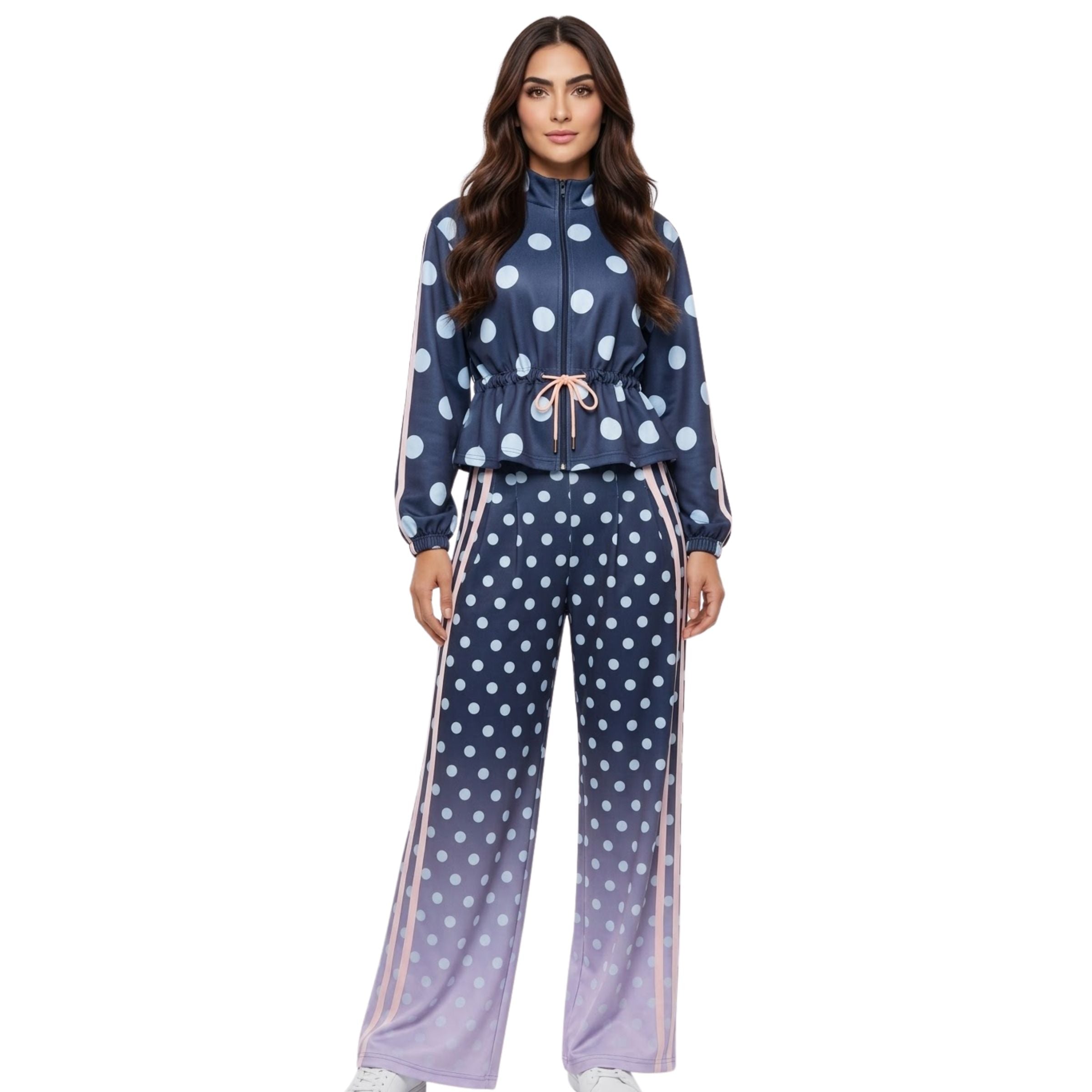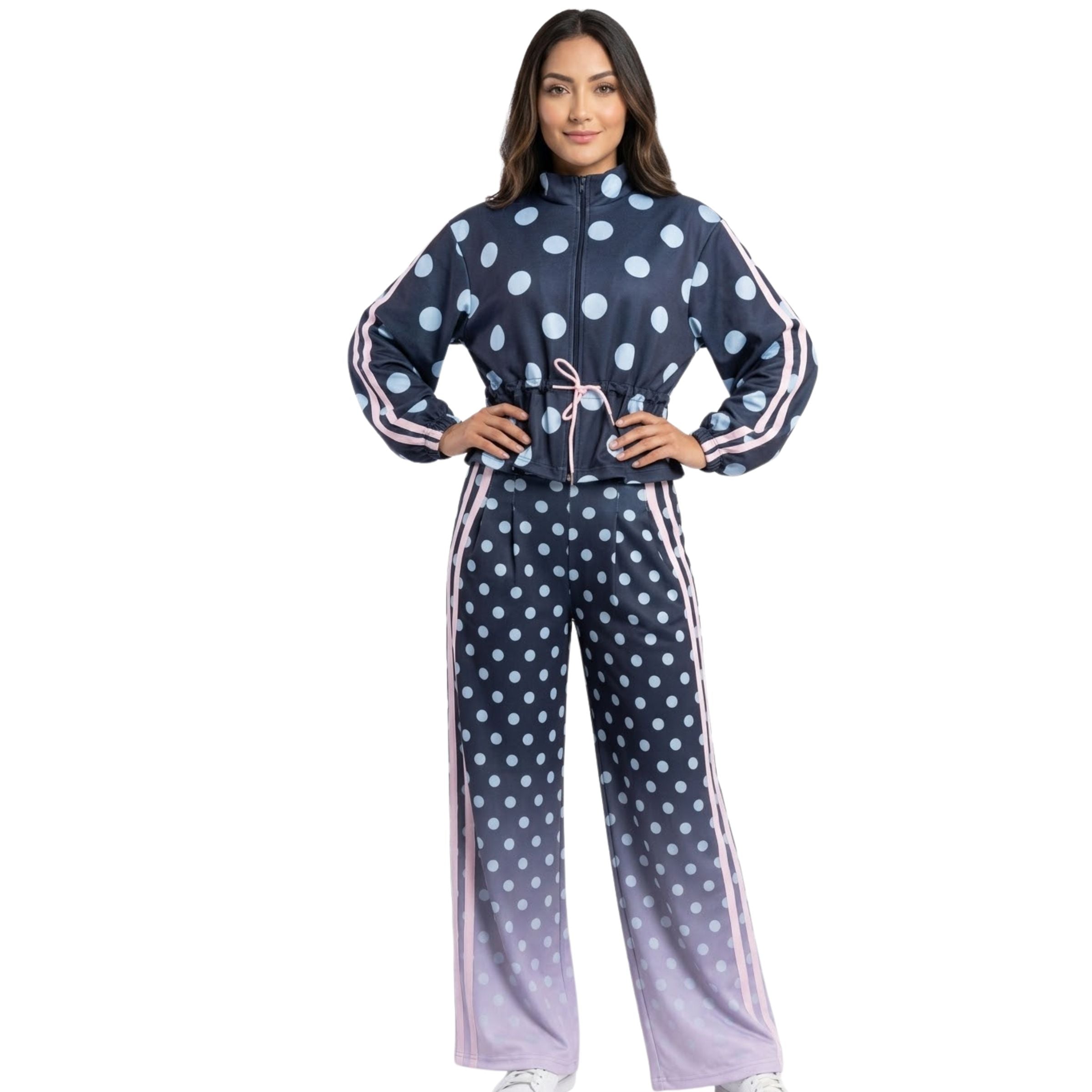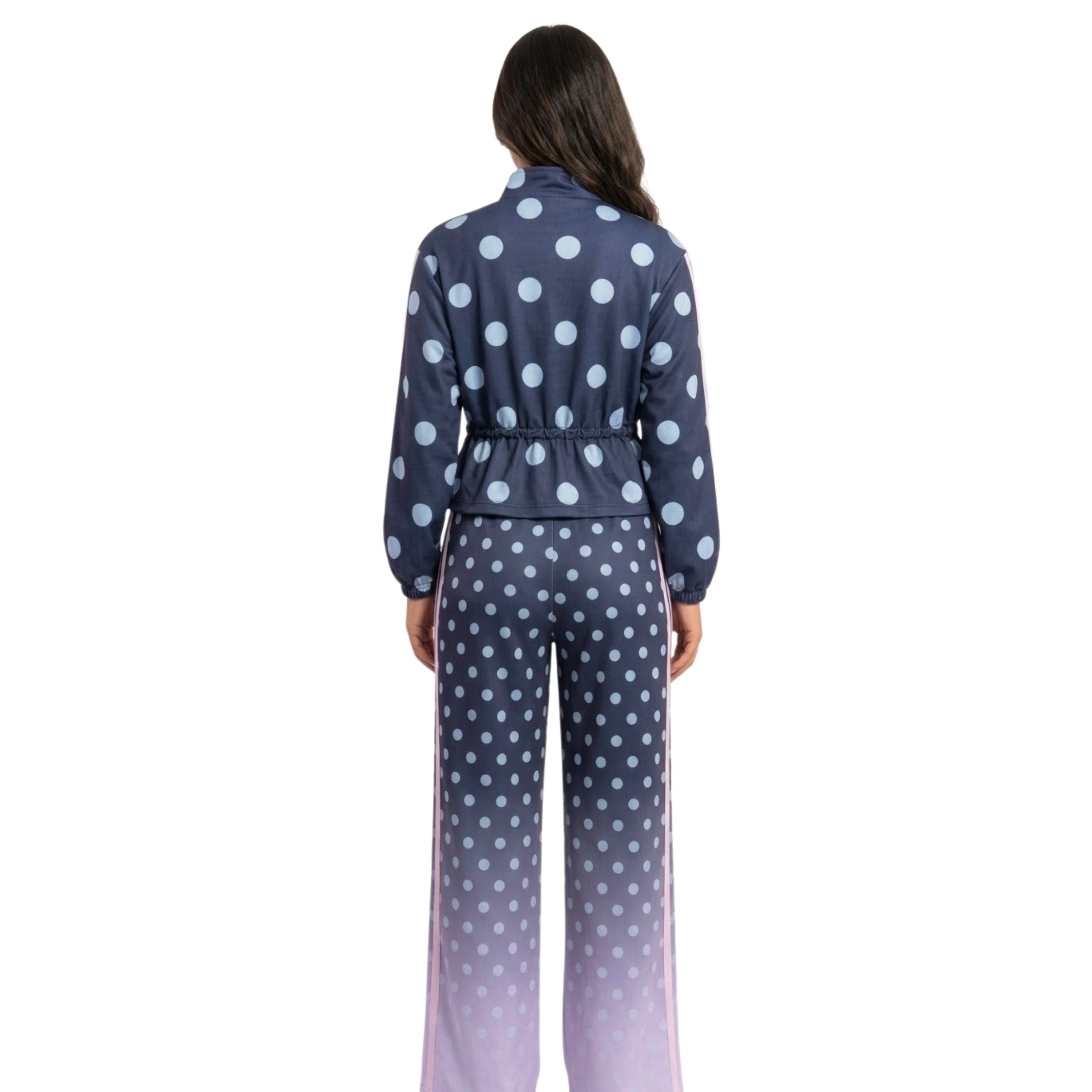 Conjunto de chaqueta con cierre y cordón, pantalón con pretina preparada, en tela ligera y liviana, con sublimado localizado de lunares, difuminado rosado en el pantalón y con líneas en los laterales