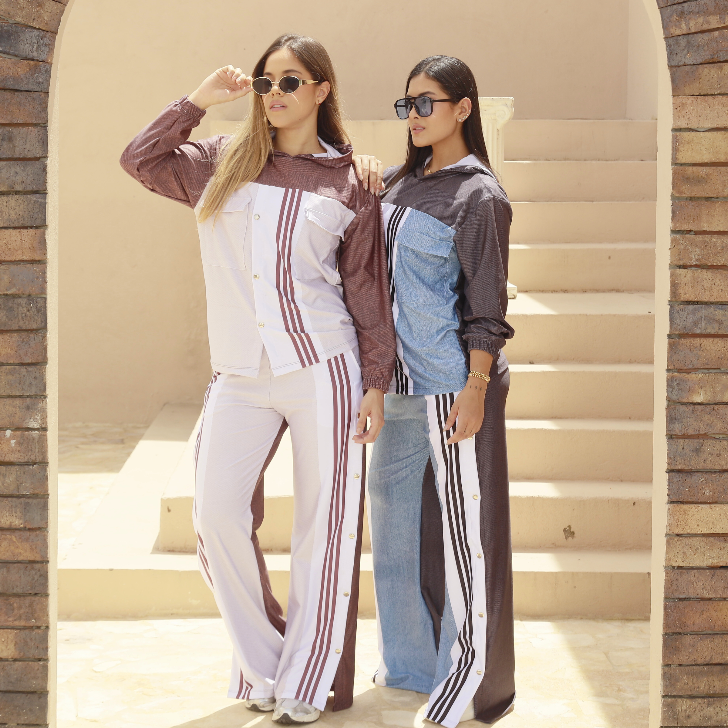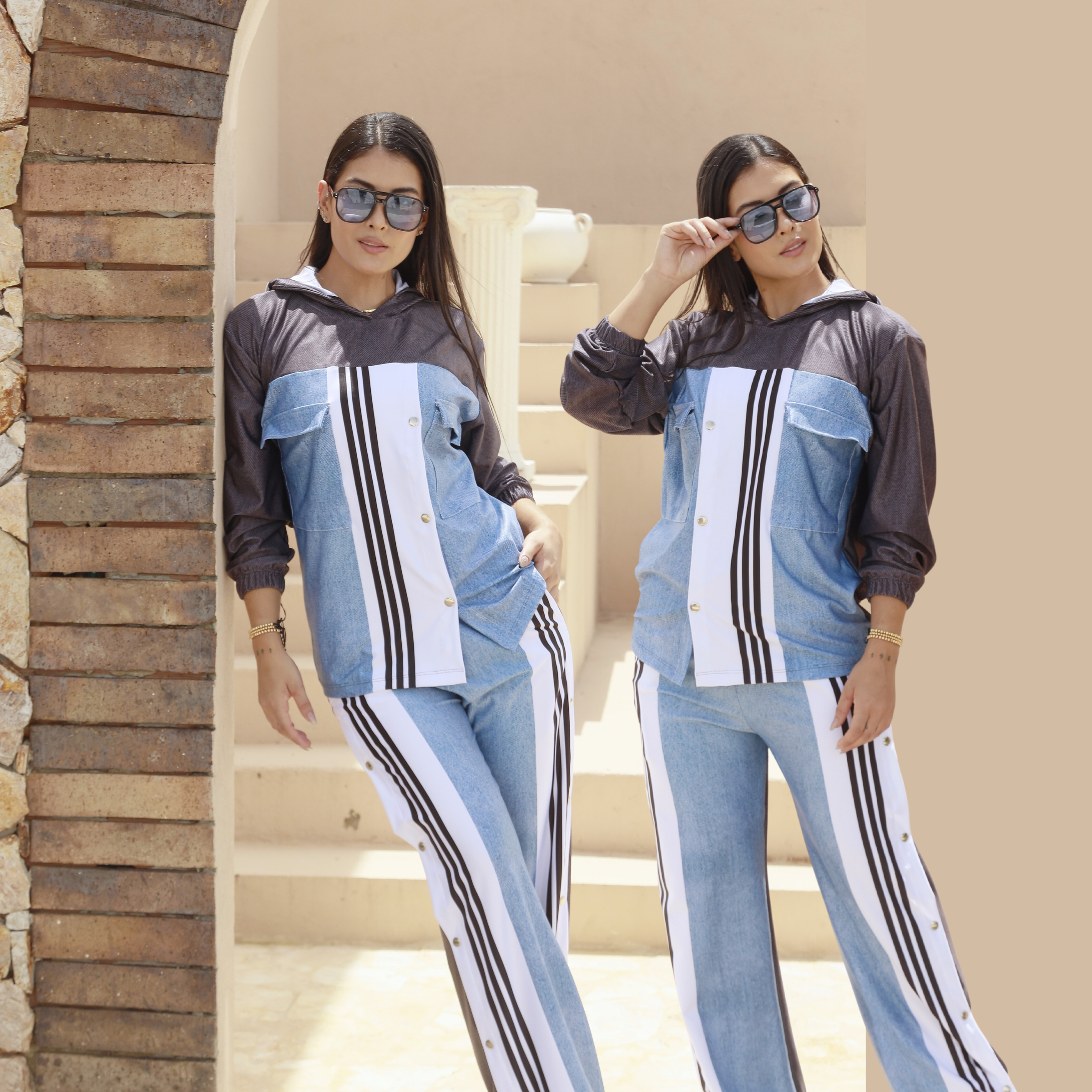 Set de chaqueta y pantalón sublimados con fondeado de jean y lineas.
