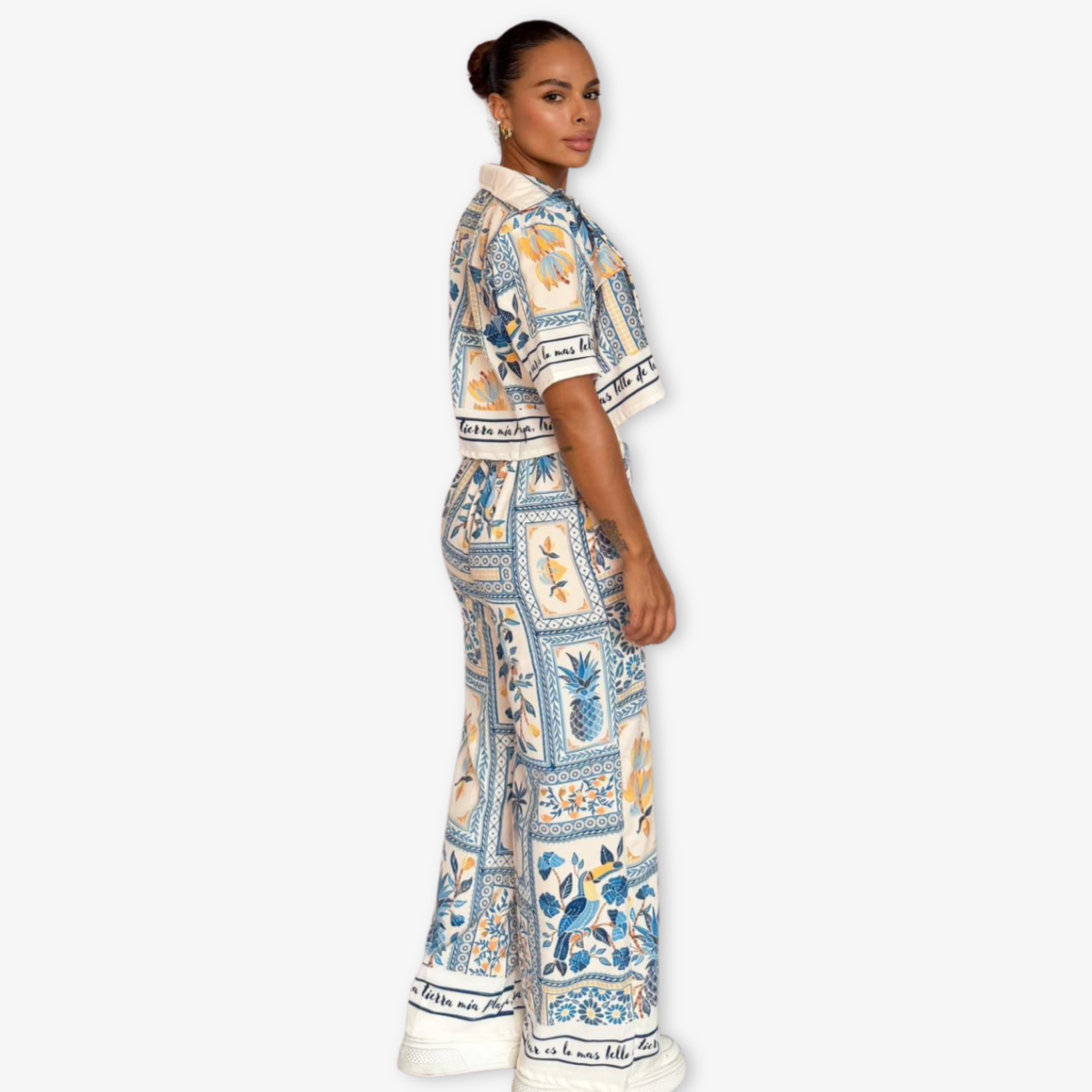 Set de camisa corta y pantalón sublimado con estampación localizada, elaborado en tejido plano liviano.