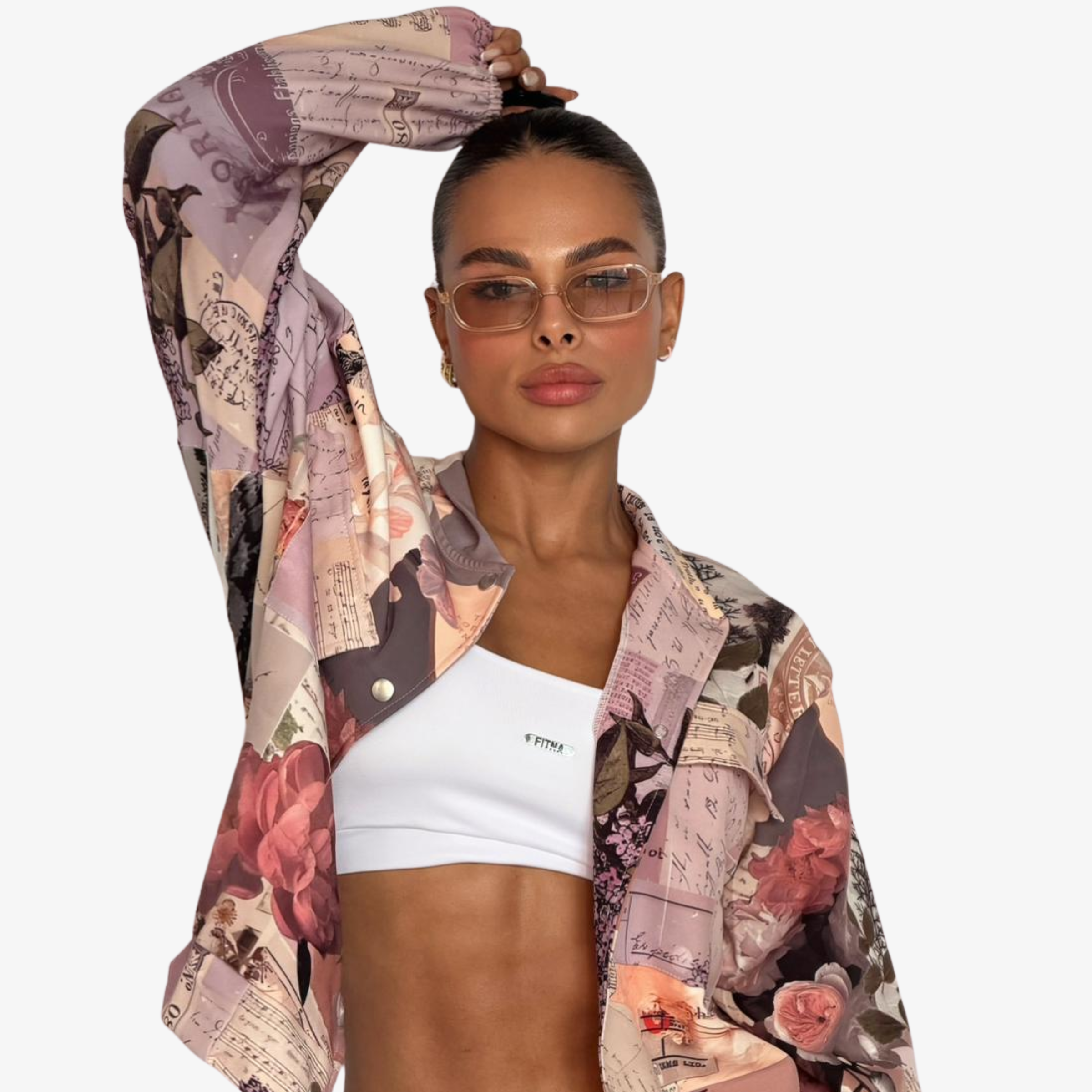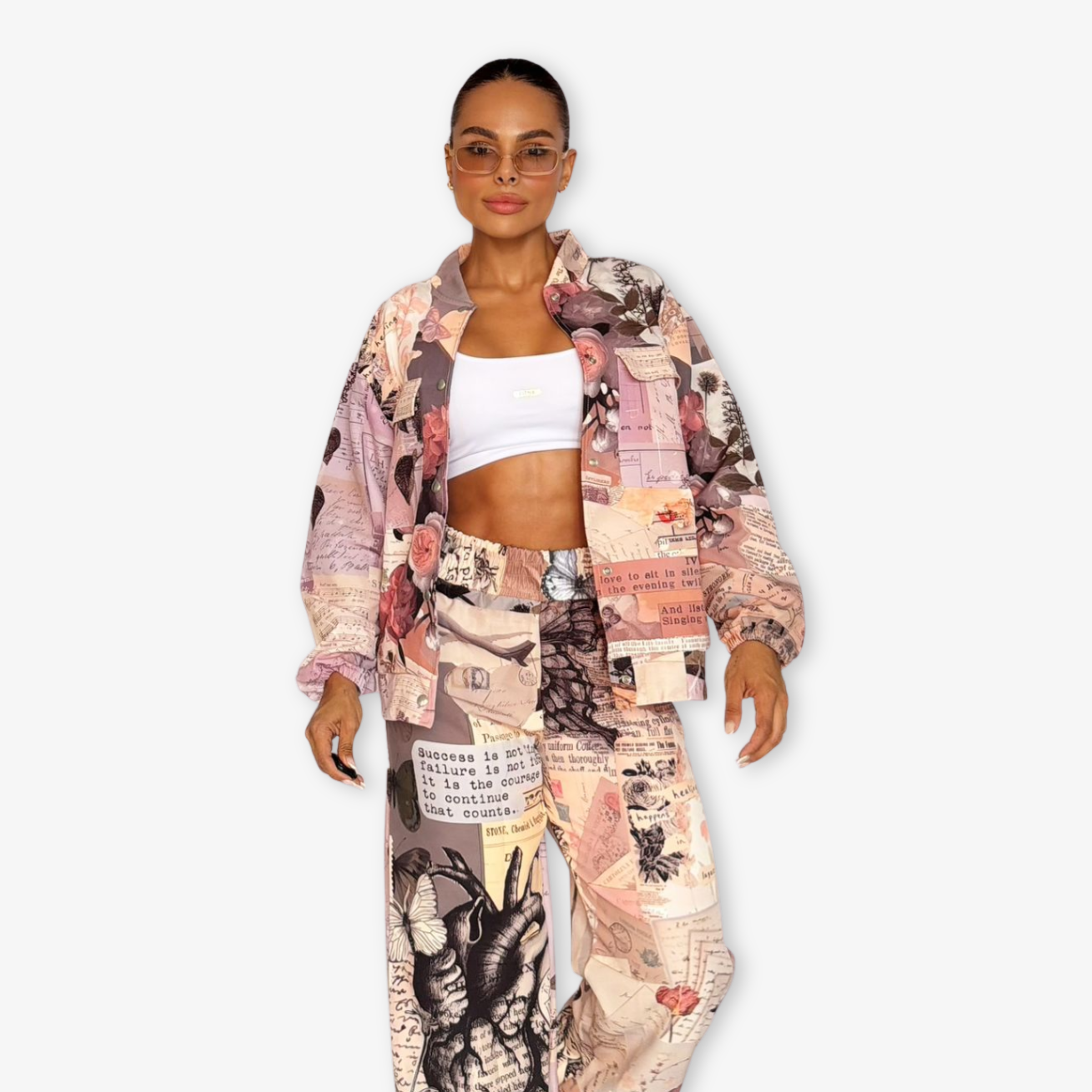 Set de chaqueta con broches y pantalón con pretina recogida.